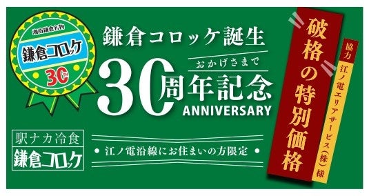 株式会社駿河屋本舗(本社:神奈川県鎌倉市 代表取締役:丸山均)は、看板商品『鎌倉コロッケ』の誕生30周年を記念し、江ノ電エリアサービス株式会社の協力のもと、2026年3月9日(月)より江ノ電鎌倉駅構内の「江ノ電鎌倉駅本店」にて、沿線住民の方々を対象とした「30周年記念 地元還元特別販売」を実施いたします。日頃の感謝を込め、通常価格1,500円以上の人気冷凍セット2種を、各税込1,000円の特別価格で販売。2月にリニューアルしたばかりの店舗にて地域の皆様をお迎えいたします。