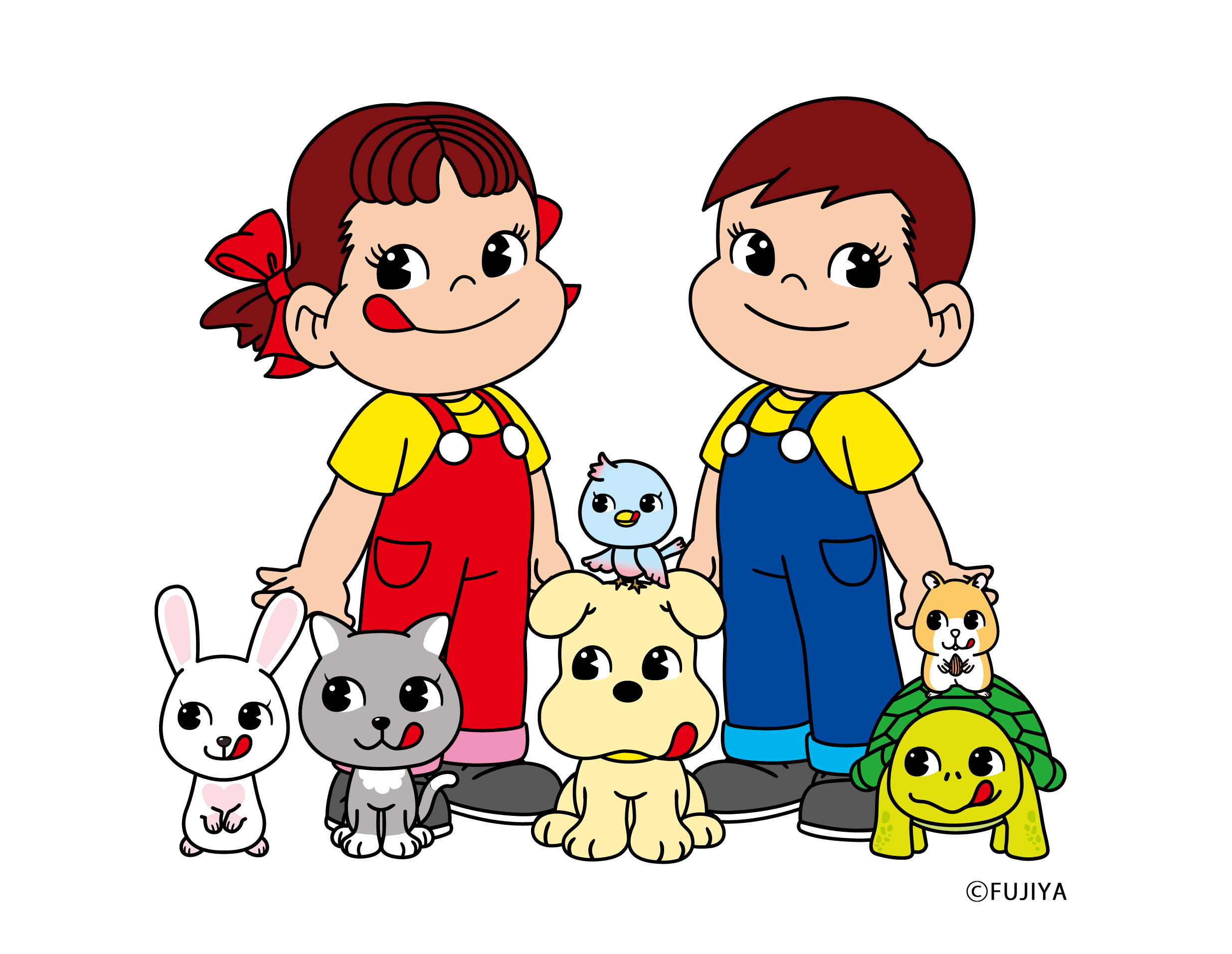 ペコちゃんは1950年に不二家洋菓子店の店頭人形としてデビューし、翌年の1951年に、ポコちゃんと一緒に「ミルキー」のパッケージに登場しました。1995年には、ペコちゃん・ポコちゃんと仲良しのおとこのこの仔犬としてドッグが誕生。それから約30年が経ち、個性あふれる新たなキャラクターたちが加わって、2026年1月に「ペコちゃんポコちゃんとゆかいな仲間たち」としてデビューしました。