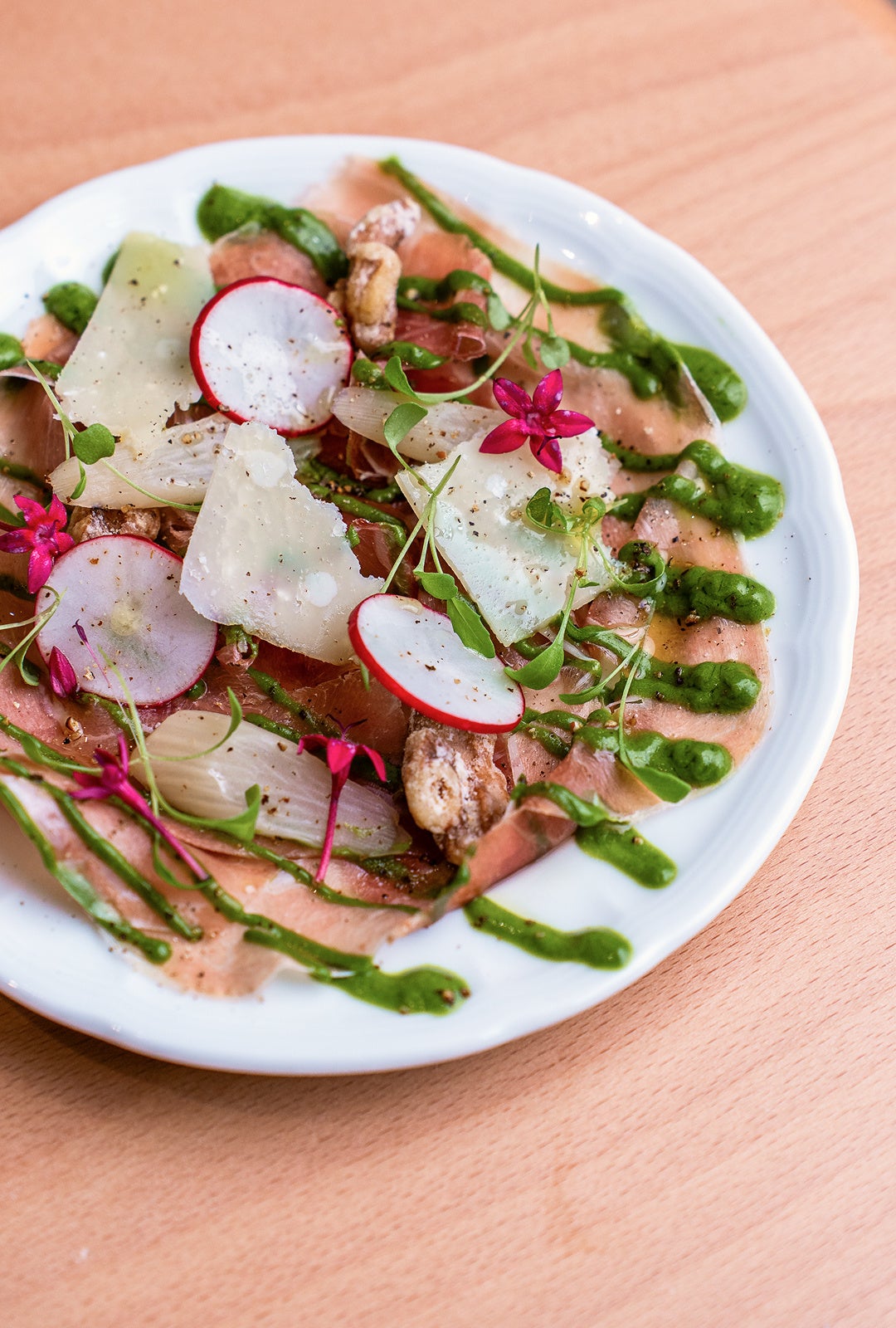 生ハムの塩味に、ほろ苦いルッコラのドレッシング、ヒハツの香りをまとった甘じょっぱい胡桃と、シークワーサーの爽やかな香りを合わせました。カクテルの甘みと桜のニュアンスを引き立てる軽やかな一皿です。