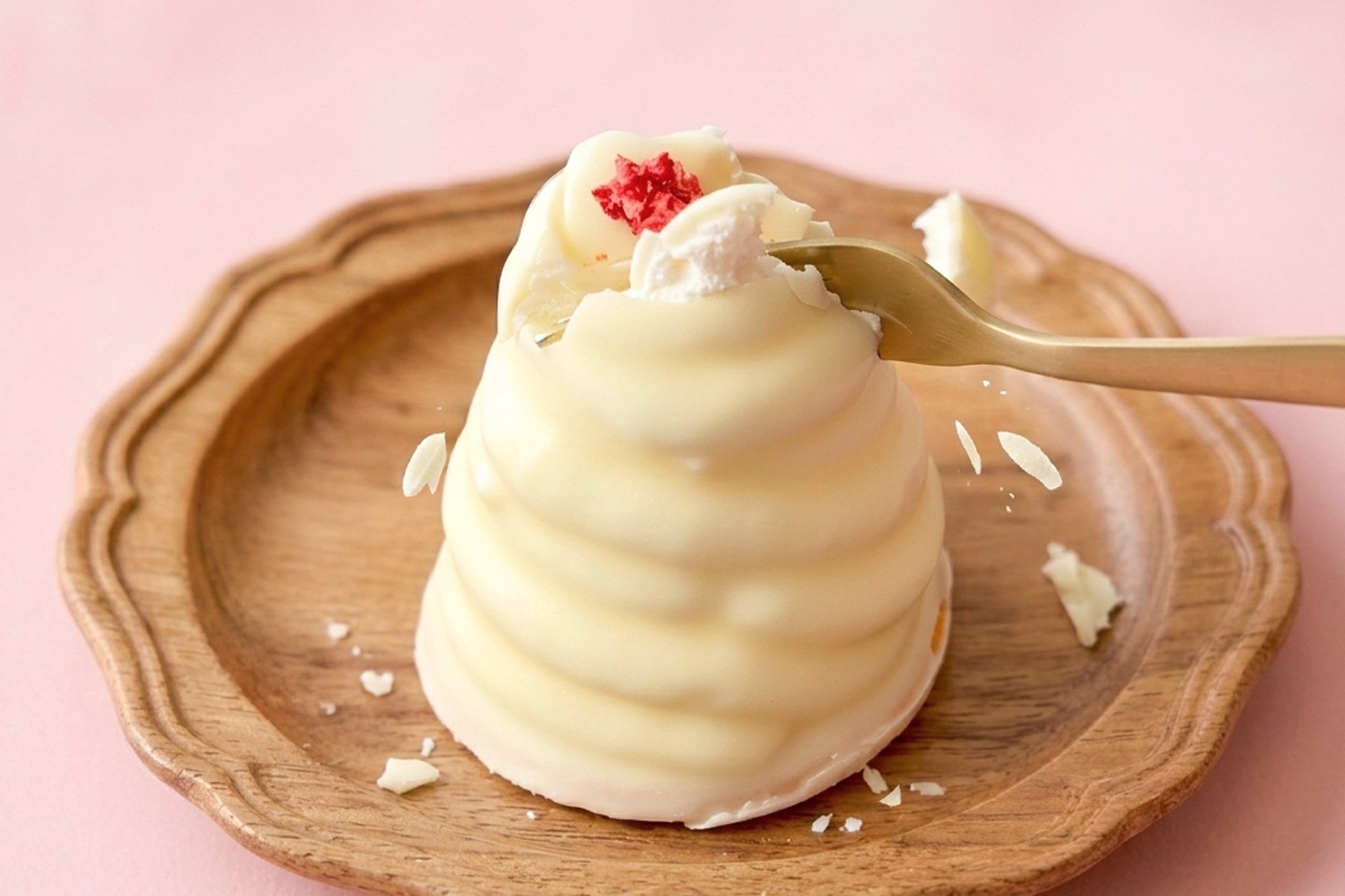 ミルクのコクがどこまでも濃く、驚くほどなめらかな口どけと上品な甘さが特徴。この「ホワイトシャンティ」のために厳選した、特別なホワイトチョコです。