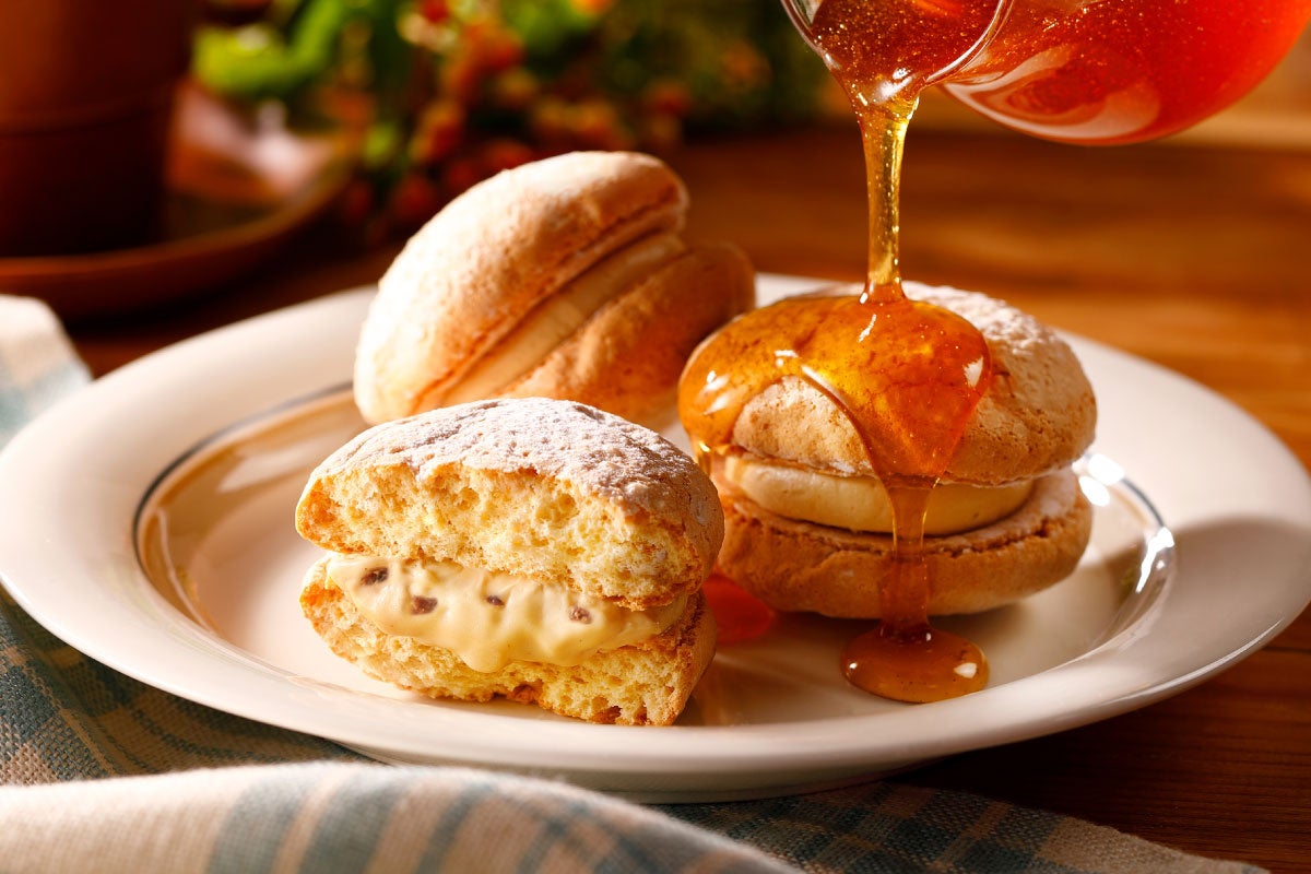 北海道産小麦を使い、さっくりふんわりと焼き上げた生地から、やさしいメープルの香りが広がります。カナダ・ケベック州でつくられたメープルシュガーとローストしたアーモンドを合わせた、なめらかなクリームをブッセ生地でサンド。香ばしい香りと心地よい食感がアクセントになっています。