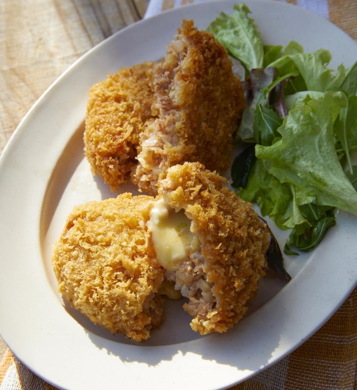 宮崎県都城市で生産される銘柄豚「観音池ポーク」のメンチカツ。自慢の豚肉をたっぷりと使い、野菜をふんだんに混ぜ込んでいます。食べたときに口いっぱいに広がる旨味と甘み、ジューシーな肉汁とふんわりした食感は、お肉と野菜のハーモニーがなせるワザです。