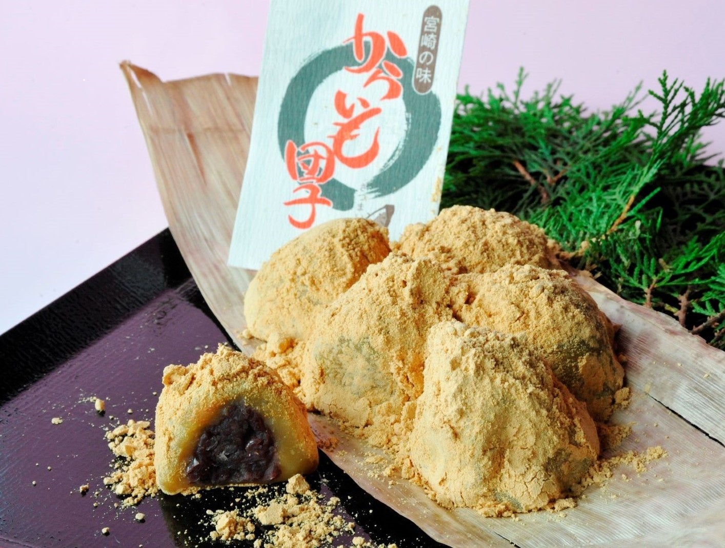 宮崎の郷土菓子「からいも団子」。 蒸したからいも(さつま芋)をつき込んだお餅に、甘さをおさえた粒あんをくるみ、きな粉をタップリとまぶしました。