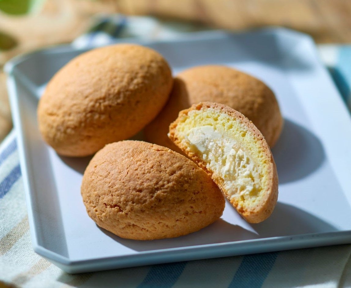 「菓子工房そらいろ」は神話の町・高千穂から。看板商品の「おひさまチーズまんじゅう」は、九州産の小麦粉とバター、宮崎県産の卵を使用した生地で、濃厚なクリームチーズを包み込みサックリと焼きあげました。