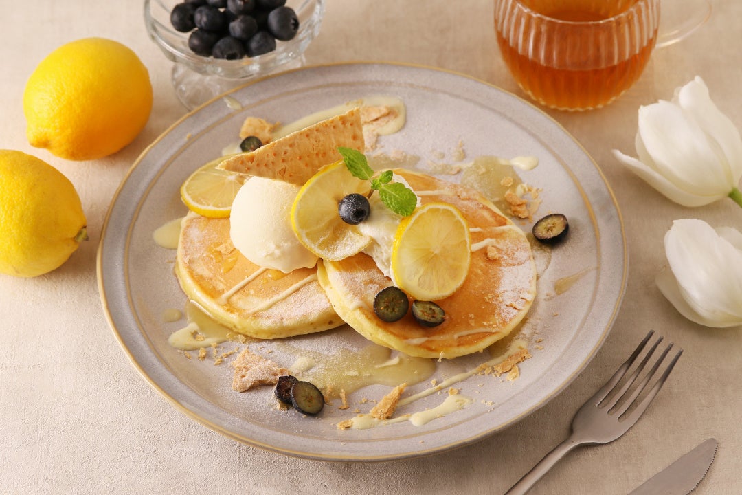 ふんわり焼き上げたパンケーキに、なめらかなレアチーズクリームと爽やかなレモンを合わせた