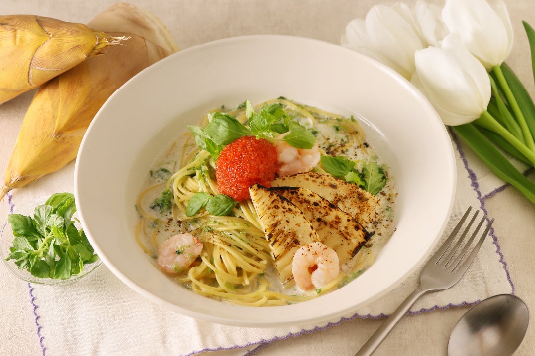 海老と焼きたけのこの磯香る豆乳クリームパスタ 明太とびっこ添え ¥1,550(税込)