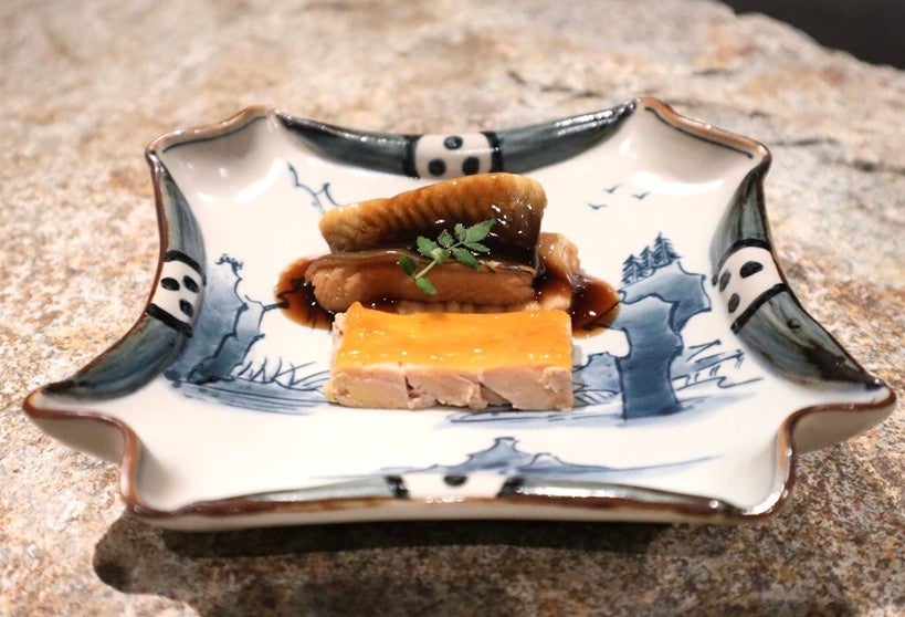 【煮穴子とフォアグラのテリーヌ】 一つ一つ手作業で骨を丁寧に取り除き、究極になめらかでとろけるような食感に仕上げた煮穴子と、濃厚なフォアグラの禁断の組み合わせ 。重厚な食材同士の響き合いを、旬のフルーツを用いた爽やかなソースが軽やかにまとめ上げ、口の中で官能的なハーモニーを奏でます 。
