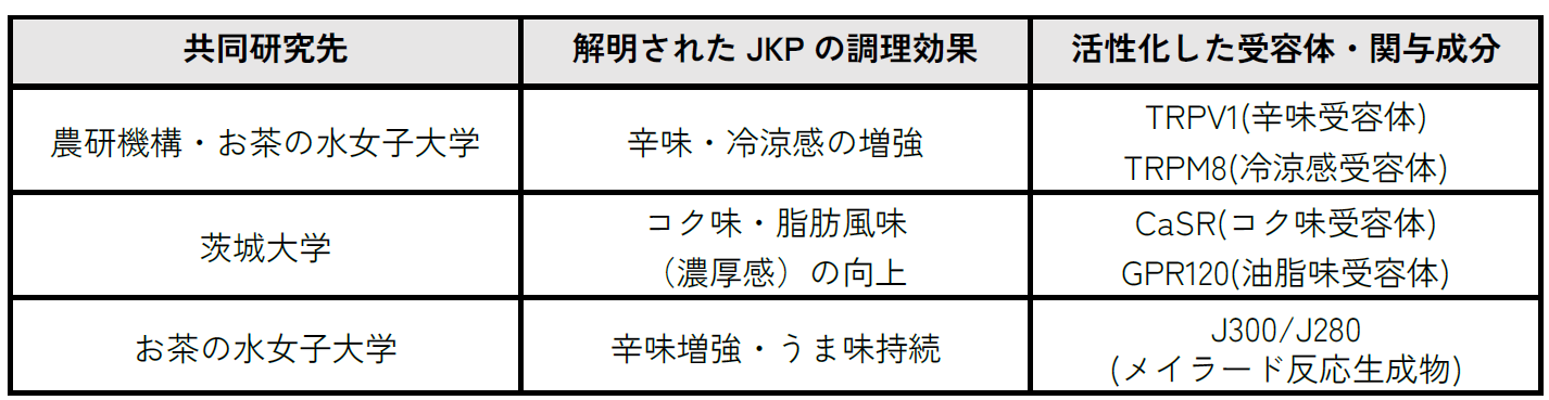 (料理の辛味を際立たせる効果)およびJ280(うま味の余韻を長く持続させる効果)が、味を変化させる正体であることを突き止めました。