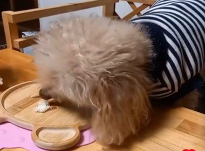 「ワンデリシャス」が生まれたきっかけは、病気のわんちゃん(左写真)の飼い主さんの悩みを聞いたことでした。だんだん食欲が落ち、薬も口にしなくなってしまったそのわんちゃん。もともと人間用のパンが好きだったことから、飼い主さんは人間用のパンと一緒に薬をあげようと考えましたが、健康面の不安から断念。代わりに犬用のパンに薬を挟んで与えてみましたが、うまくいかなかったそうです。