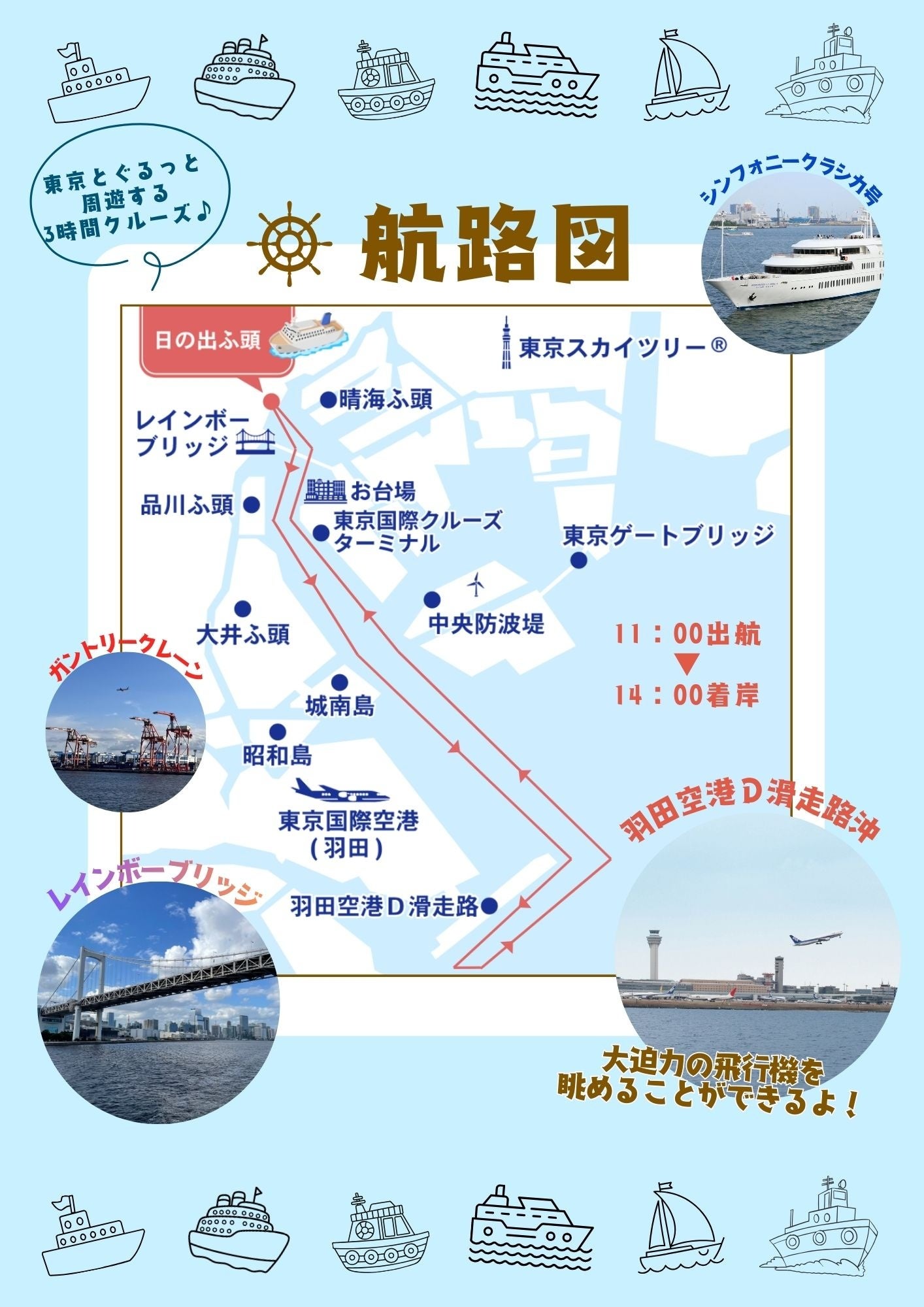 クルーズは3時間。船内からはレインボーブリッジや大井ふ頭のガントリークレーン、羽田空港D滑走路沖から大迫力の飛行機を眺めることができます。