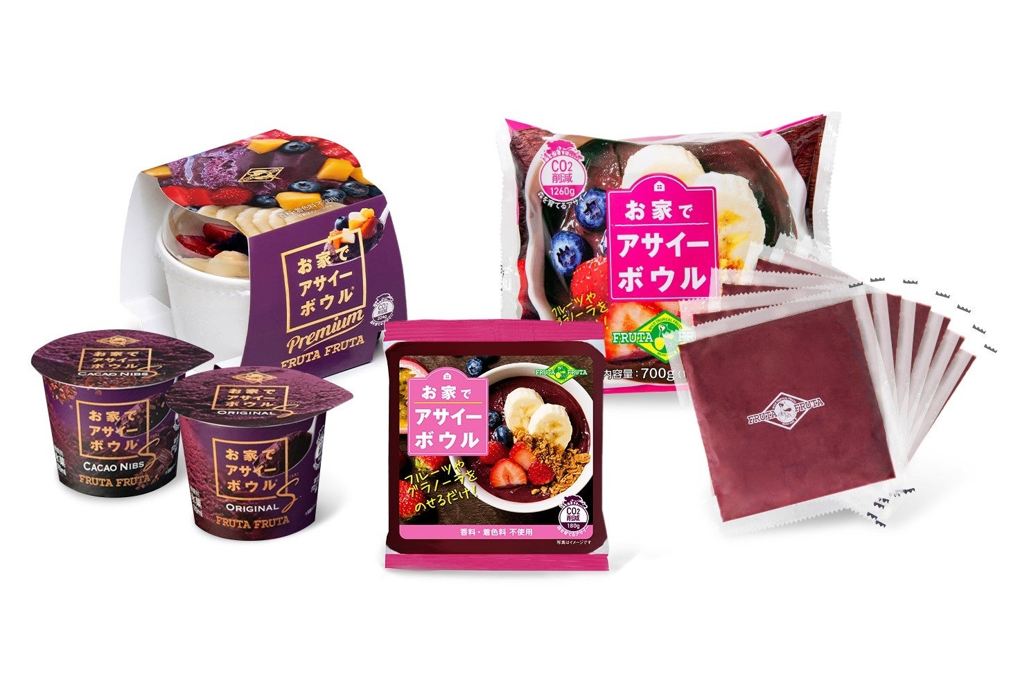 2012年に発売した冷凍ミックスベースの「おうちでアサイーボウル」(100gパック)から派生し、1週間分セットの「おうちでアサイーボウル 7パック」やカップ入りアサイーボウルの「おうちでアサイーボウル プレミアム」がラインナップするシリーズです。いずれも「#おうちでアサイーボウルしよう」をキーメッセージに、ミキサーやブレンダーを使用せずにご自宅で本格アサイーボウルをつくれる手軽さが特徴です。香料、着色料は使用せず、アサイーの濃厚さとフレッシュな味わい、そしてフルッタフルッタのこだわりである「ナチュラル・新鮮・おいしい・本物」をモットーとした品々です。