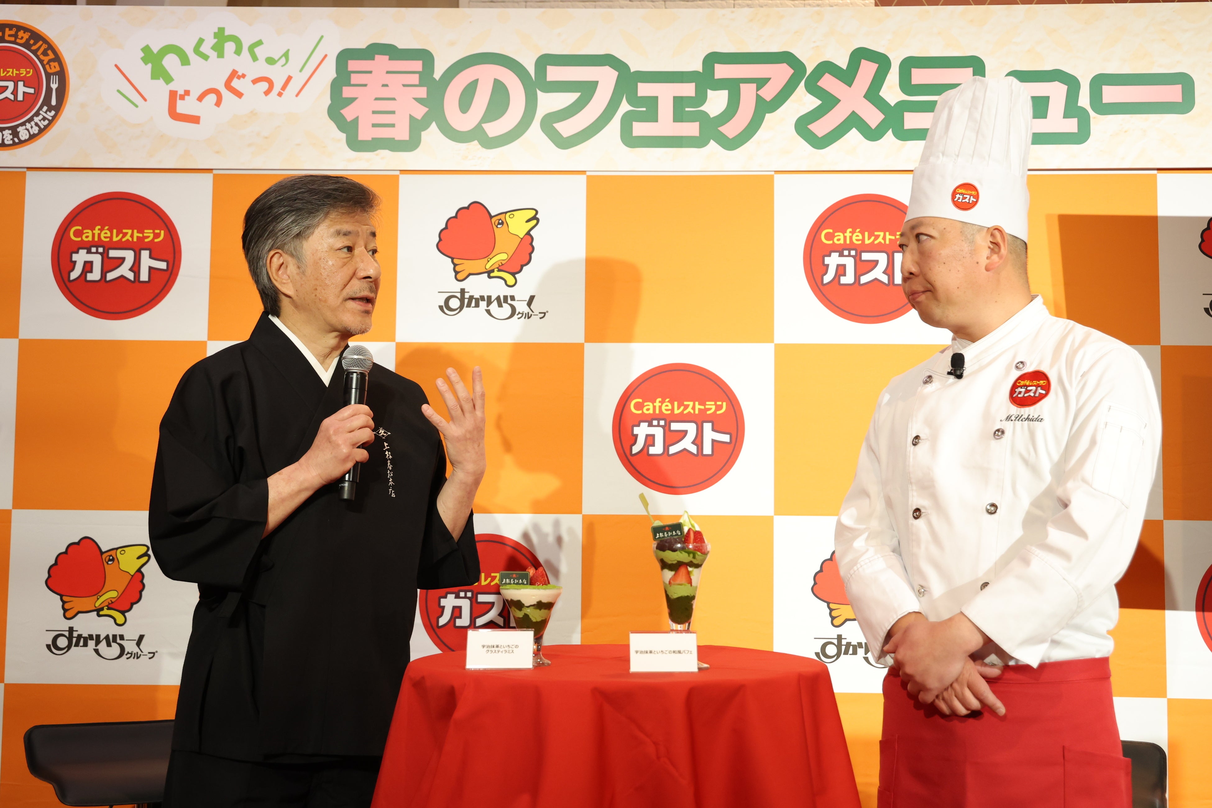 発表会冒頭では、ガストメニュー開発グループディレクター六笠のご挨拶の後、洋食の巨匠「レストラン大宮」の大宮シェフ監修の特製デミグラスソースで味わう『THE 職人ハンバーグ』、創業450年の老舗茶舗「上林春松本店」監修の『宇治抹茶といちご』スイーツをご紹介し、匠や老舗の皆様と磨き上げたクオリティのメニューをリーズナブルな“ガスト価格で”楽しめることを発表しました。
