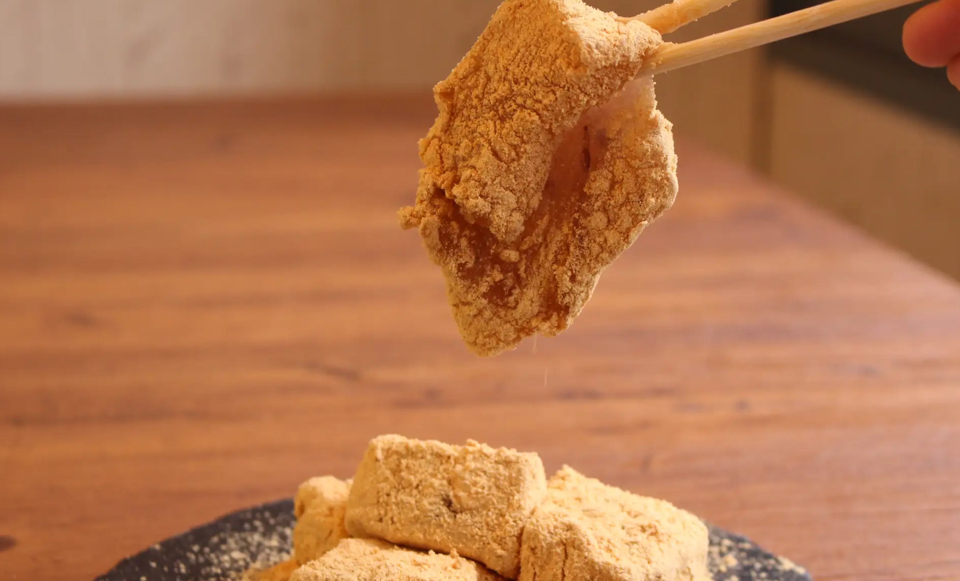 爪楊枝が刺さらない程の柔らかさで、お箸で食べていただく「生わらびもち 和三盆きな粉」(小箱650円、大箱1,200円)。