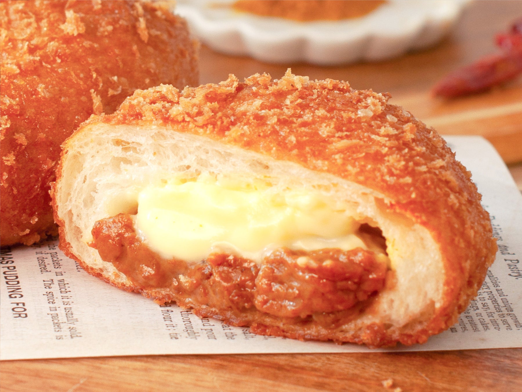 北海道産小麦「ゆめちから」を100%使用したパン生地で、特製カレールーと、北海道産生乳から作られたフォンデュチーズを包み込み、カリッと揚げています。衣はサクサク、パン生地はもっちり。ひと口かじると、中からとろ〜りと溶け出すチーズと、コク深いカレーが広がります。2021年のカレーパングランプリ®で最高金賞を受賞し、日本一に輝きました!