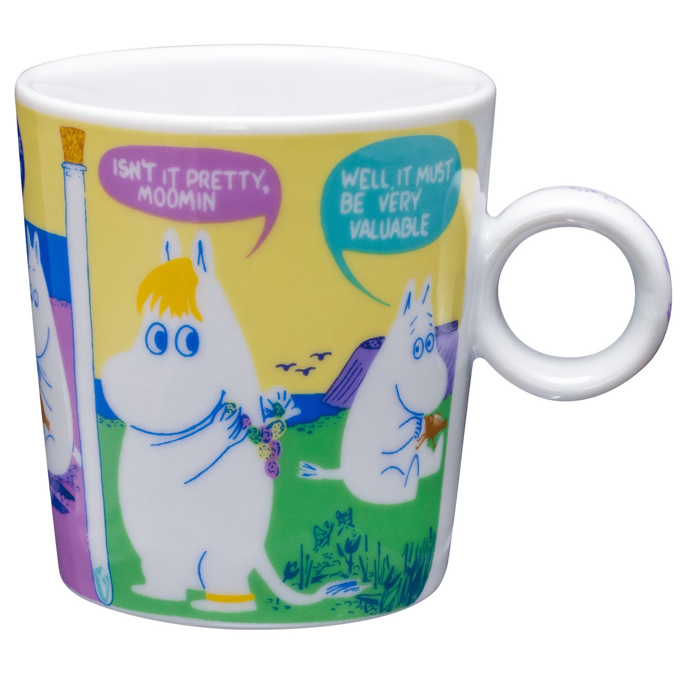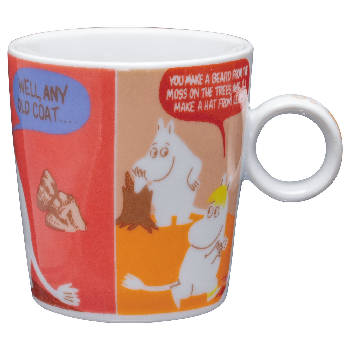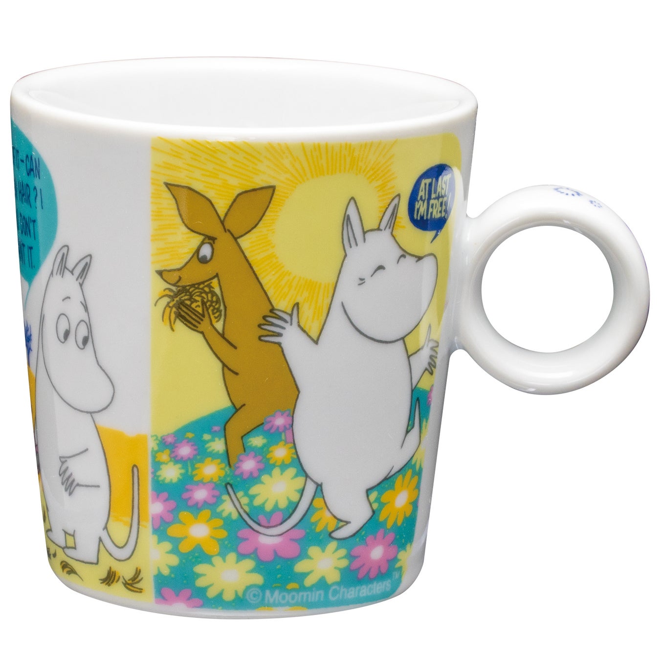 ムーミンのコミックスのワンシーンを、カラフルな配色で再現。2柄を並べても違和感のないバランスに仕上げました。360℃どこを正面にしても楽しめるデザインです。