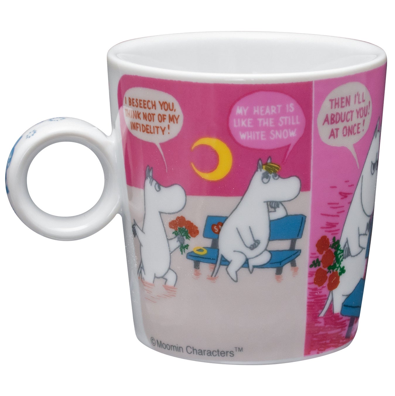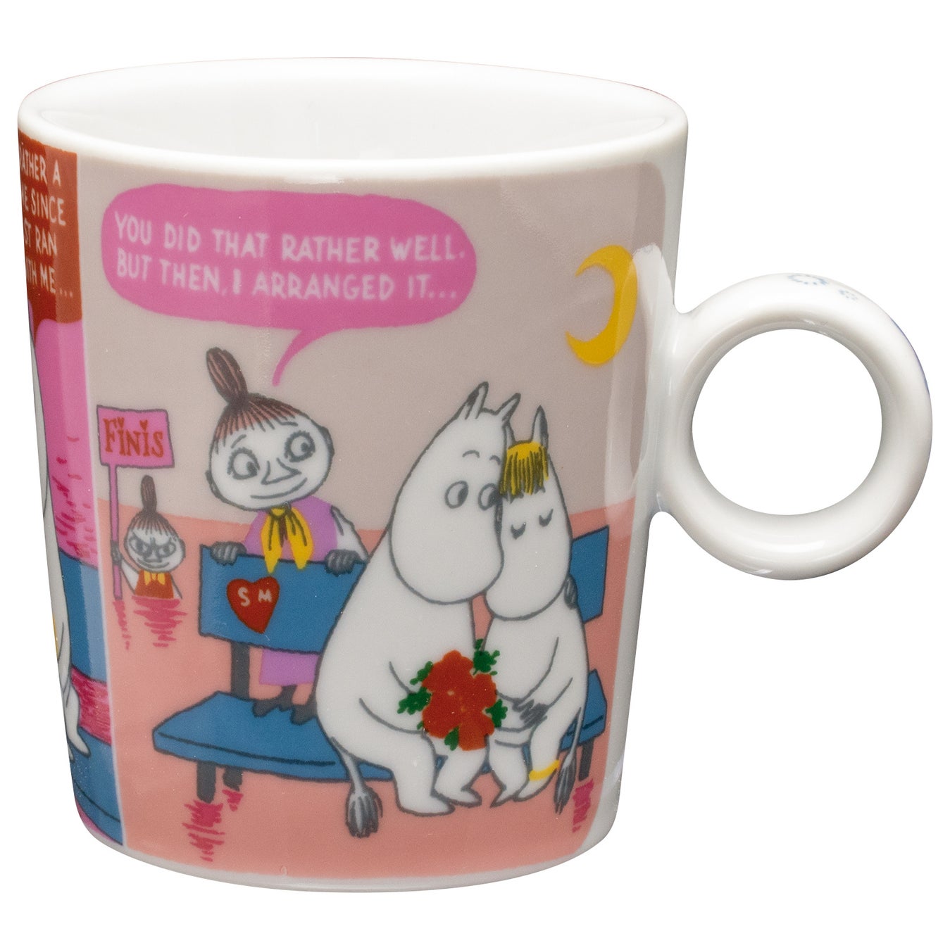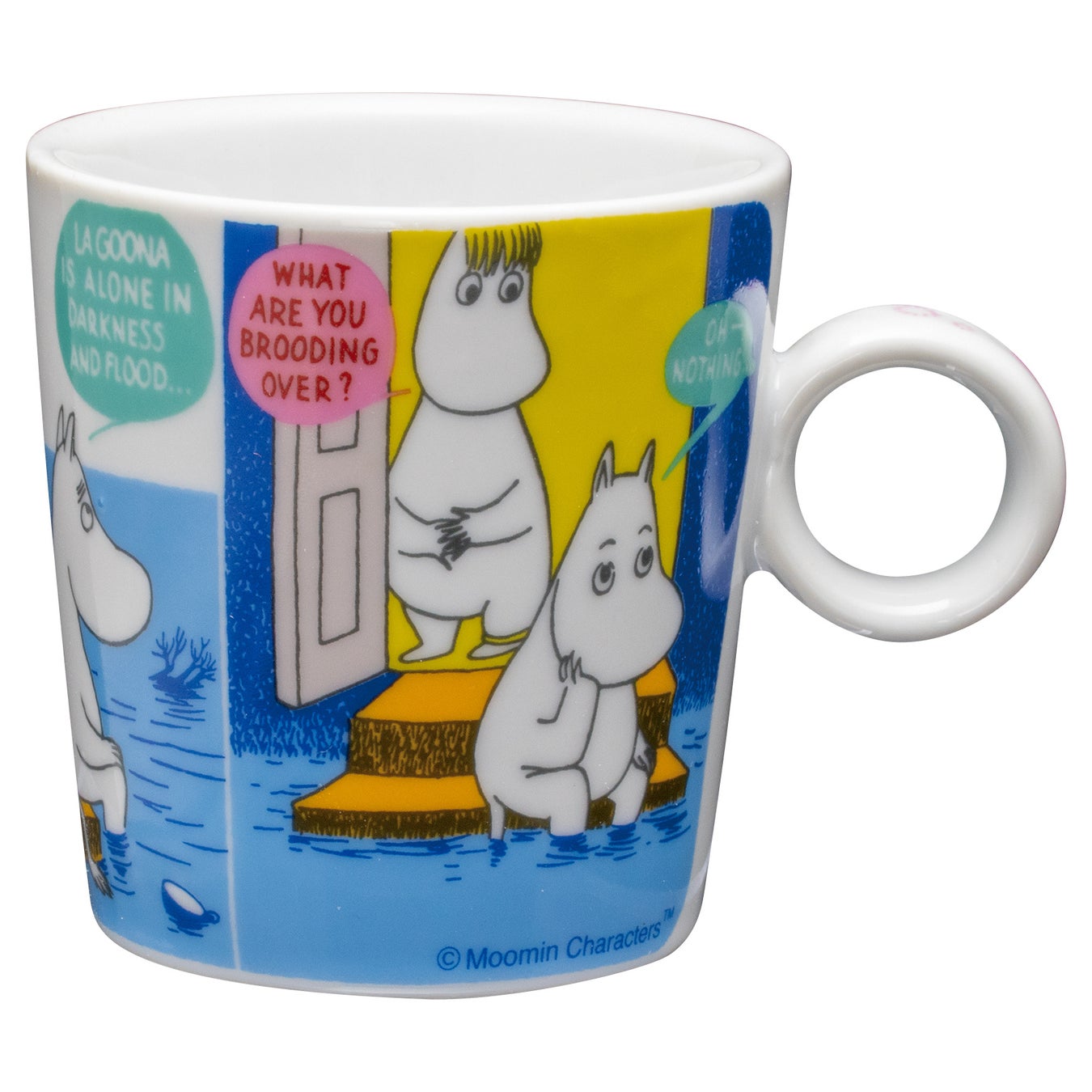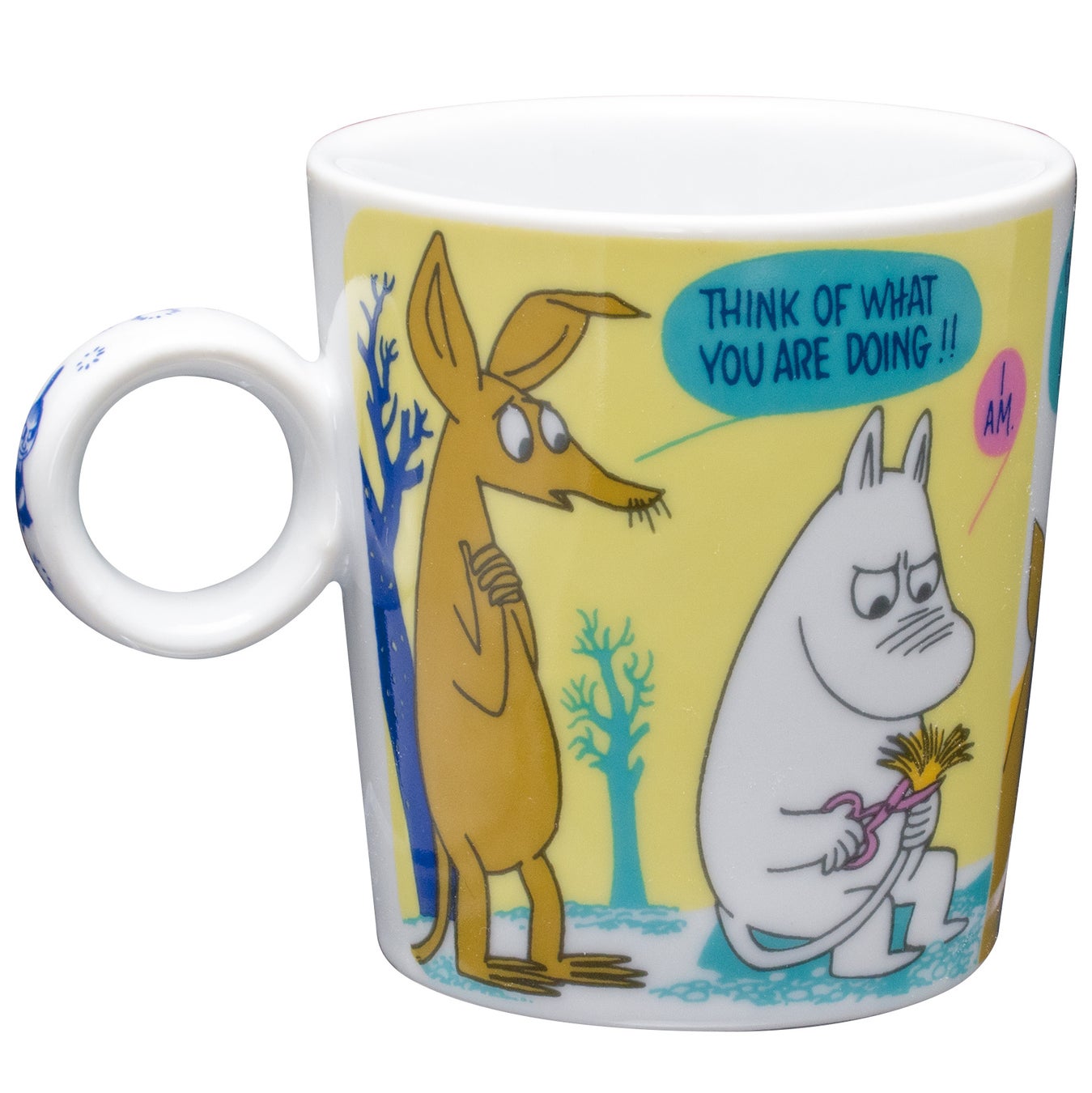 ムーミンのコミックスのワンシーンを、カラフルな配色で再現。2柄を並べても違和感のないバランスに仕上げました。360℃どこを正面にしても楽しめるデザインです。