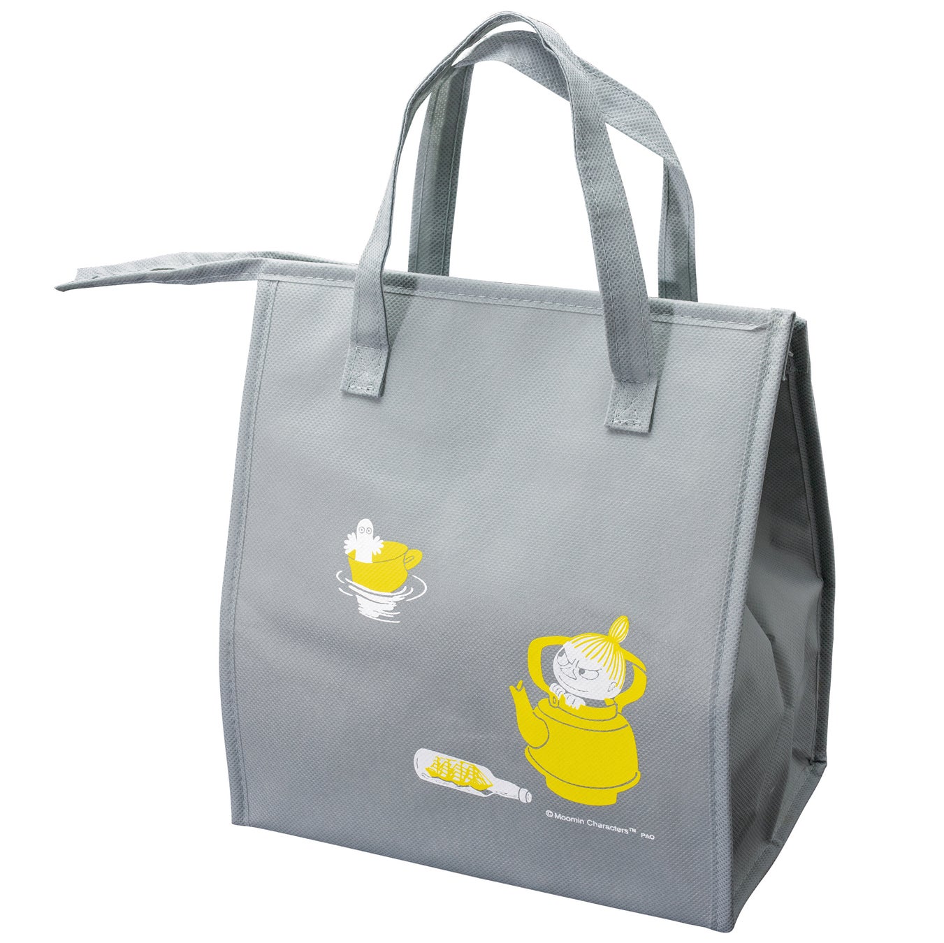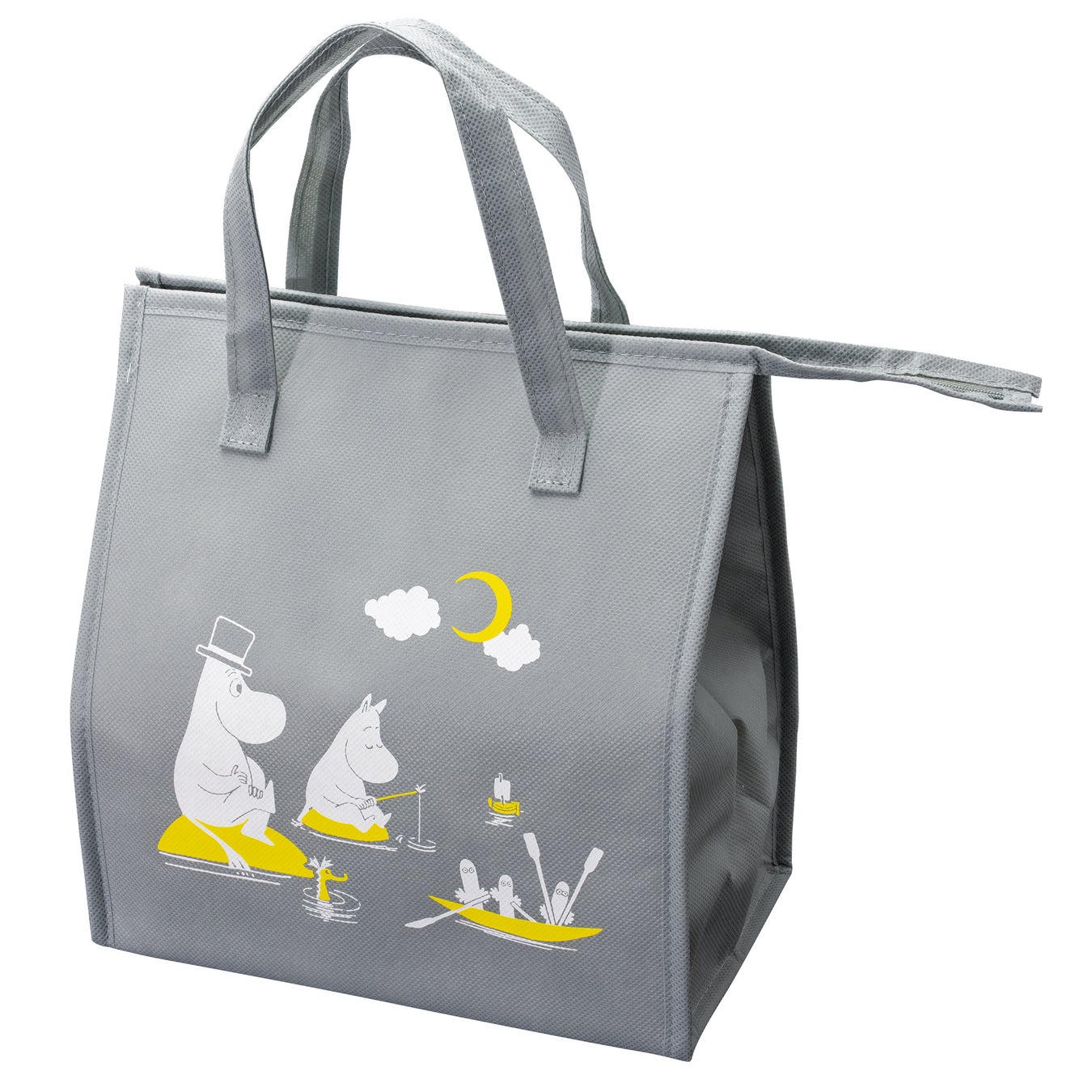 使いやすいグレーをベースに、黄色をアクセントにしたデザイン。月明かりの下で、ムーミンパパがムーミンやニョロニョロと釣りを楽しむ様子を描いています。裏面には、やかんを船に見立てたリトルミイのイラストを配置しました。