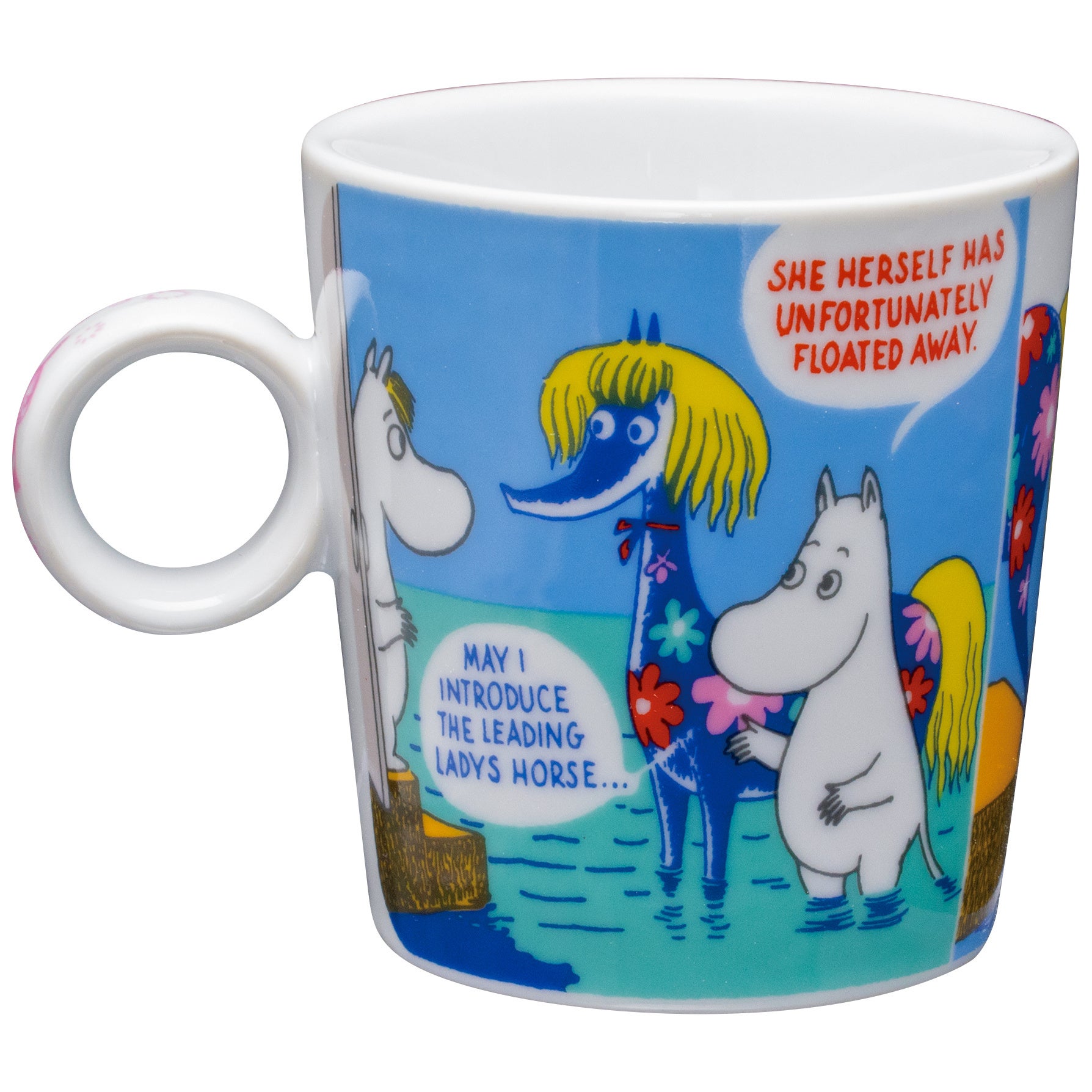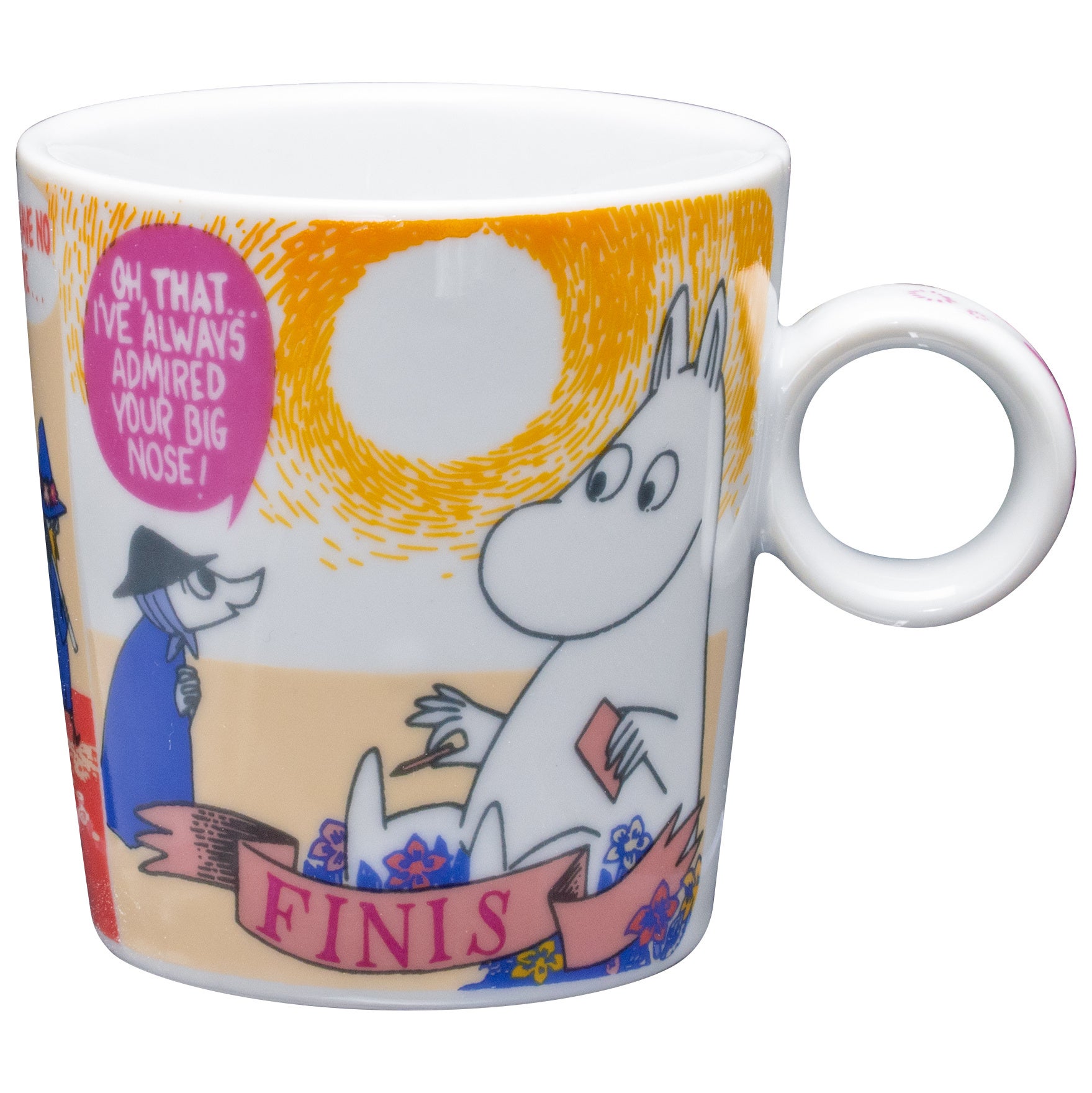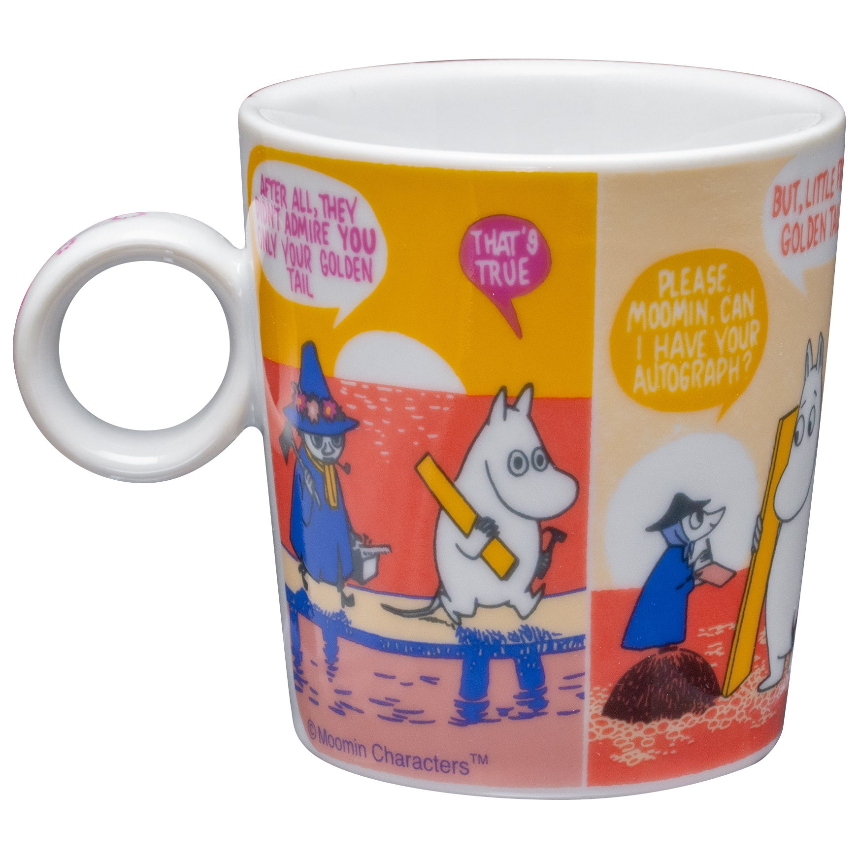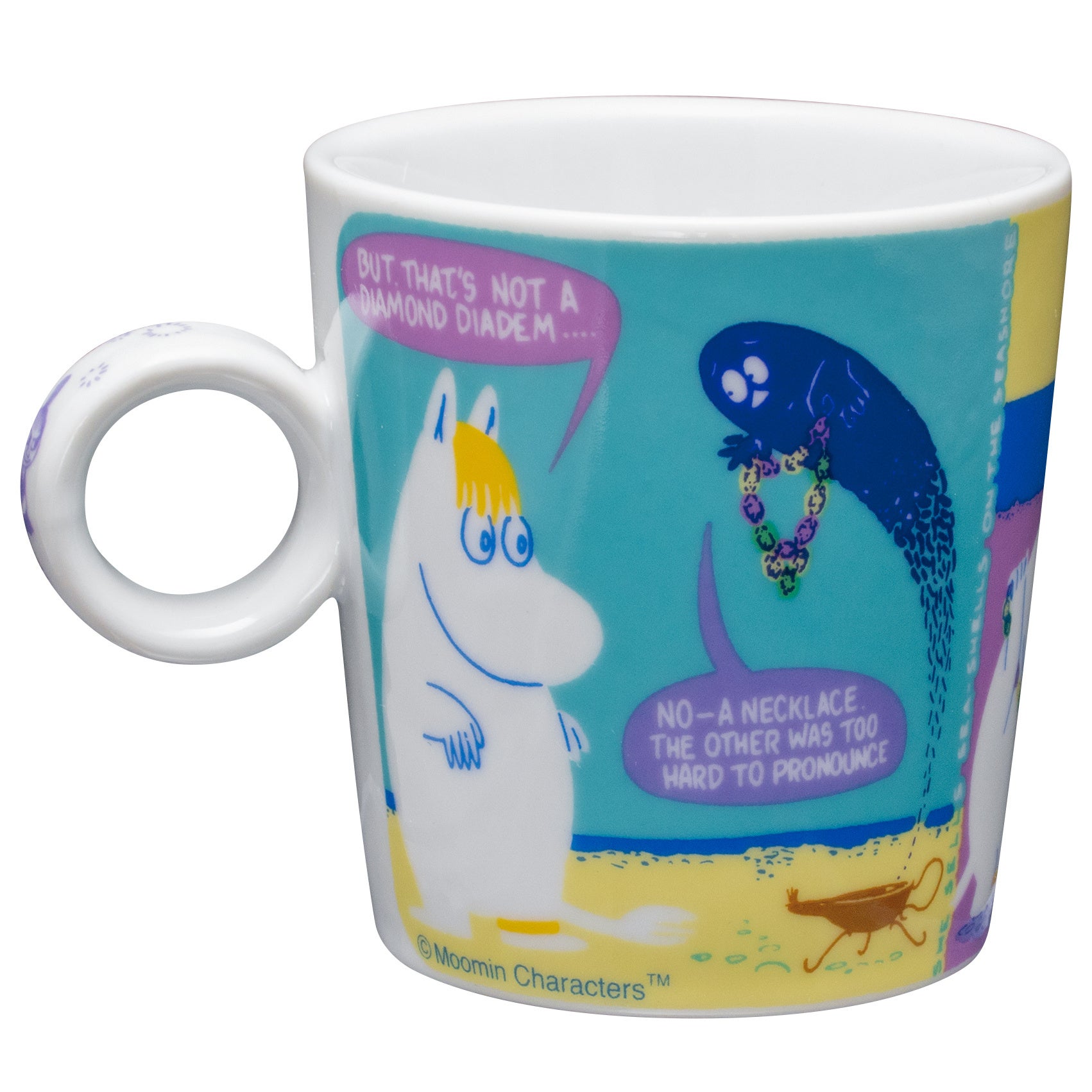 ムーミンのコミックスのワンシーンを、カラフルな配色で再現。2柄を並べても違和感のないバランスに仕上げました。360℃どこを正面にしても楽しめるデザインです。