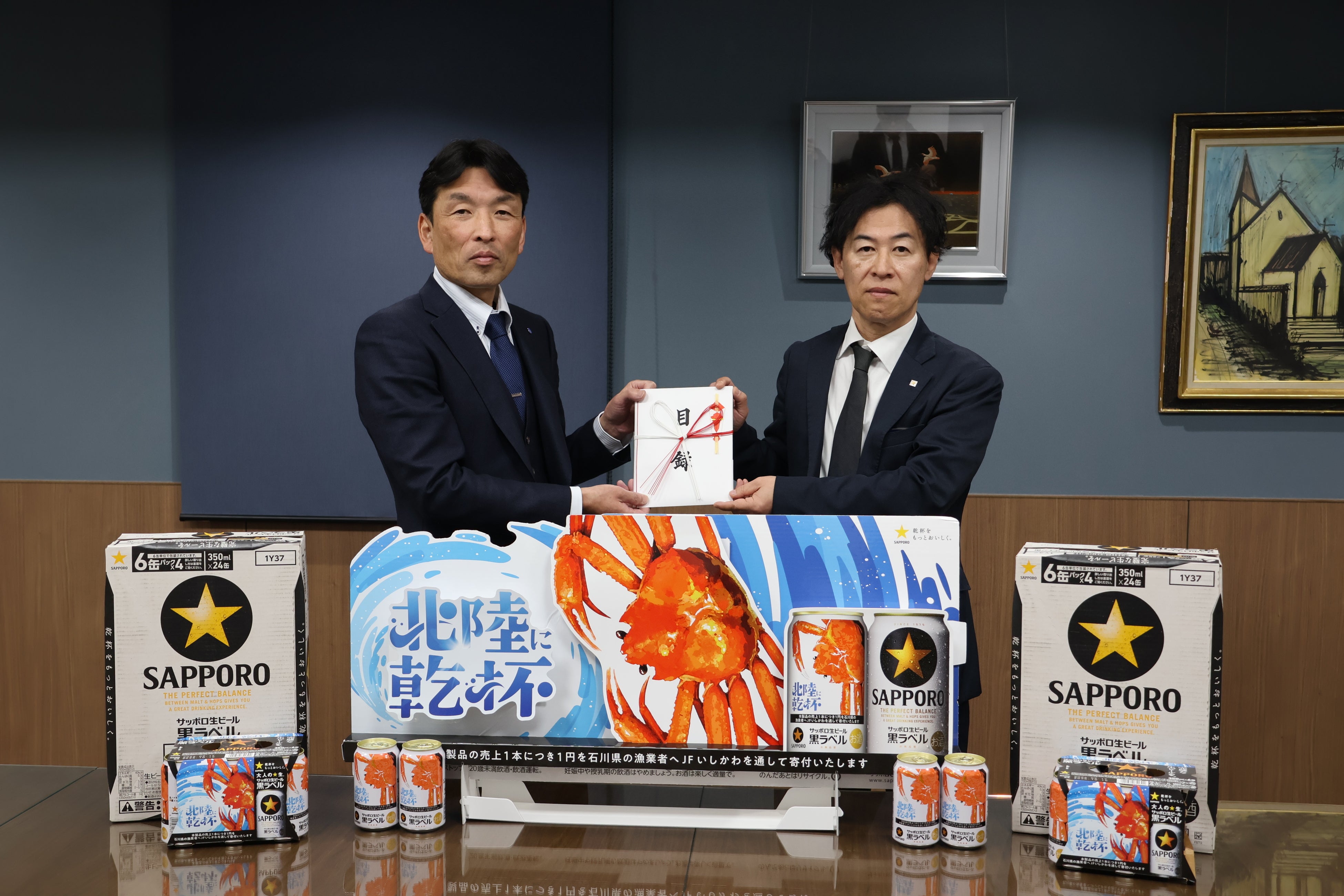 サッポロホールディングス(株)のグループ企業であるサッポロビール(株)は、昨年10月に東海北陸7県で数量限定発売したサッポロ生ビール黒ラベル「北陸かにデザイン缶」(注1)の売上の一部を3月9日(月)に「JFいしかわ」へ寄付しました。