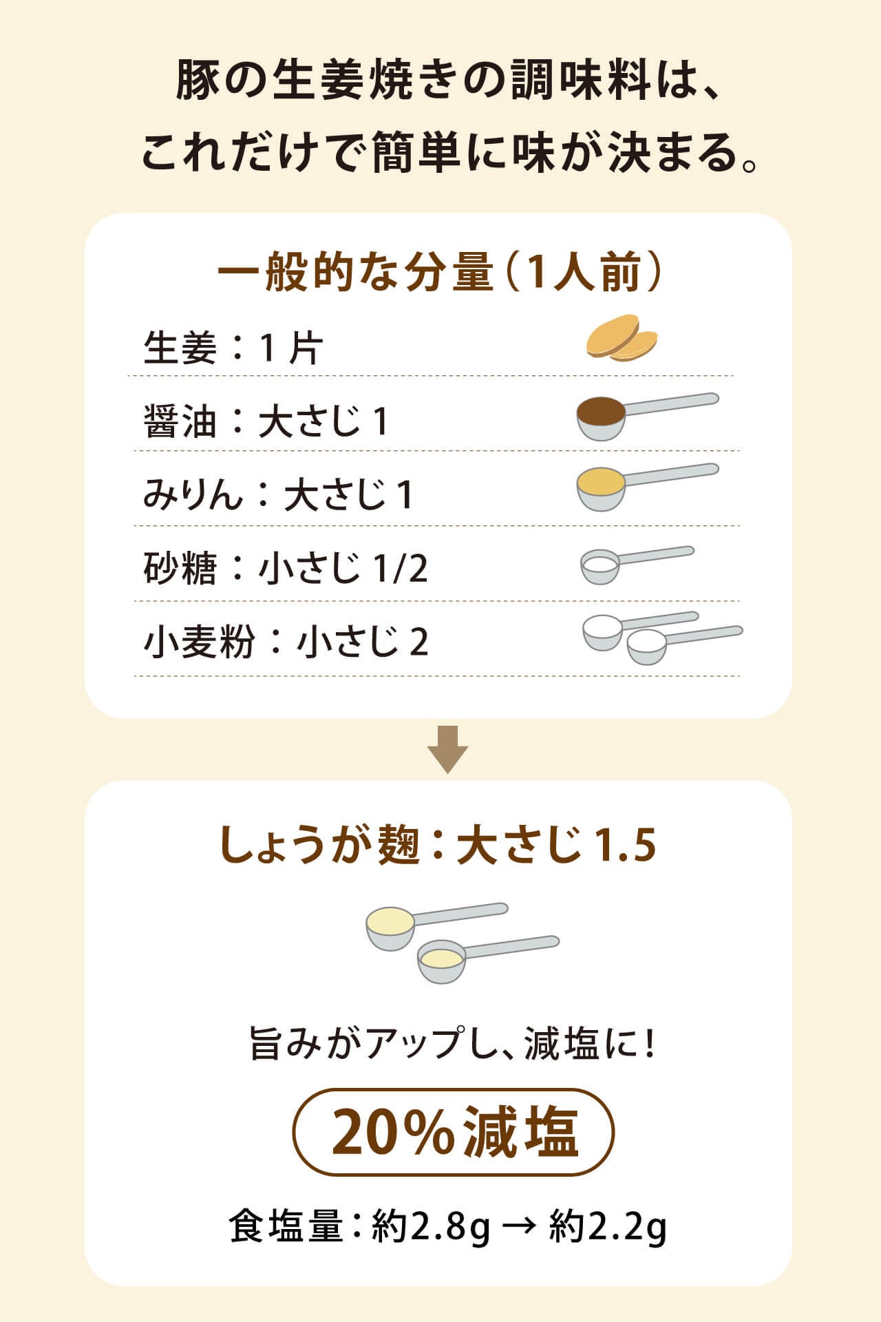 豚の生姜焼きが「ひとさじ」で完結。麹で叶える、おいしい「減塩、砂糖・小麦粉不使用」をサポート!
