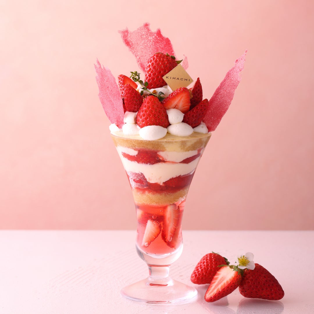 全店で楽しめる苺スイーツとして、シグネチャーの「KIHACHIのナポレオンパイ」、甘酸っぱい苺をメインに、マンゴー、パパイヤなど彩り豊かなフルーツを自家製クレープにあわせた「苺と彩り果実のクレープ アプリコットソース」、苺が引き立つシンプルな仕立ての「苺のショートケーキ バニラアイス添え」の3種が順次登場します。