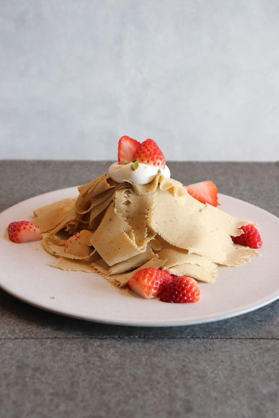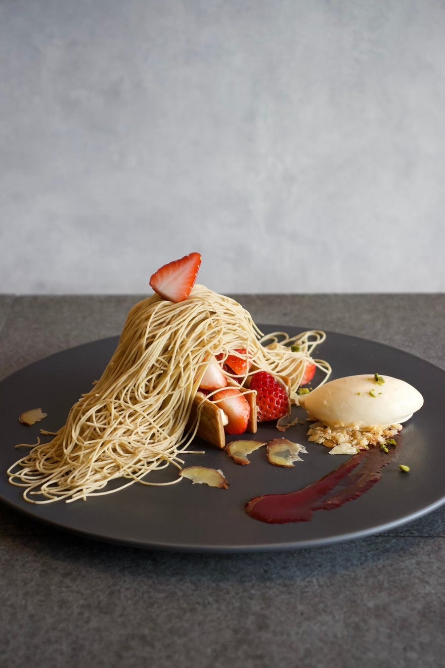 サクサクに焼き上げたパイと甘酸っぱい苺を重ねたミルフィーユに、錦糸状のモンブランクリームをお絞りしました。