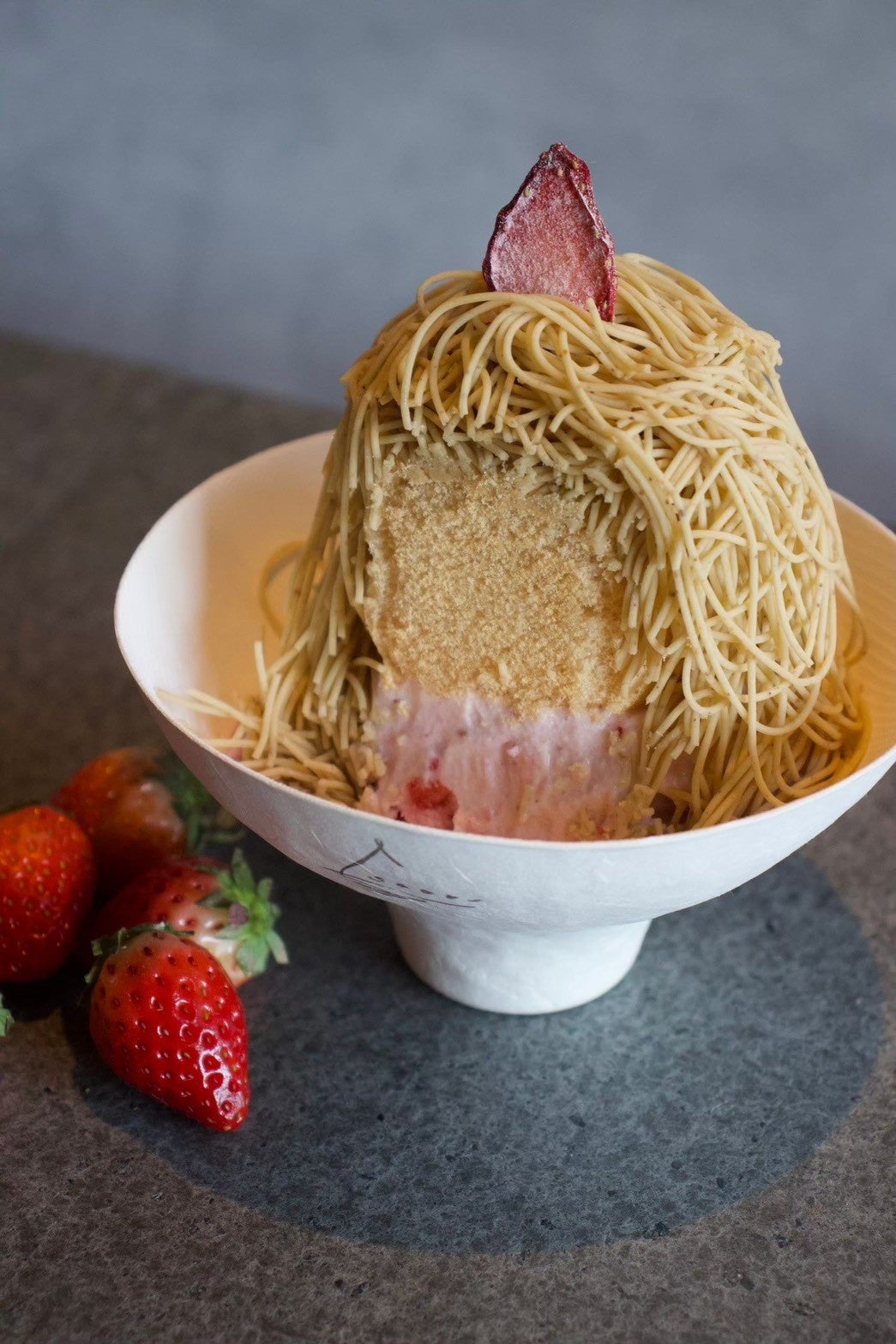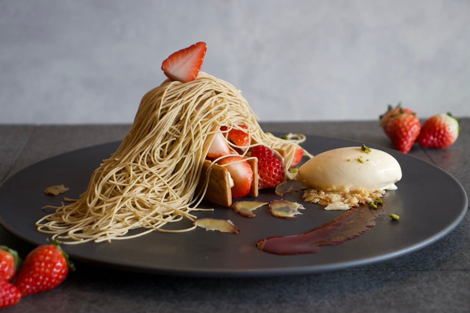 サクサクに焼き上げたパイと甘酸っぱい苺を重ねたミルフィーユに、錦糸状のモンブランクリームをお絞りしました。
