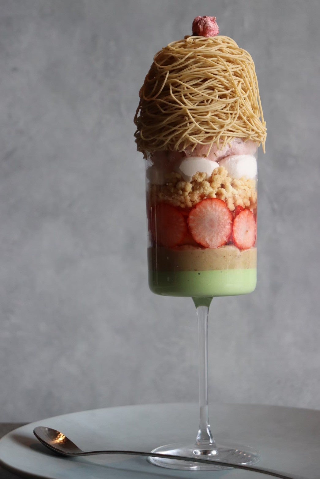 和栗×国産苺×抹茶。季節のおいしさと京都らしさを掛け合わせた季節限定のパフェです。