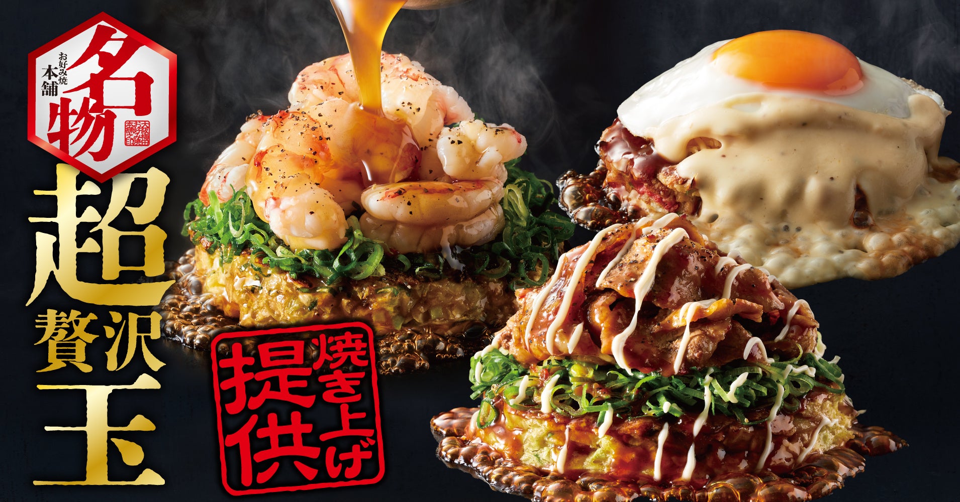 看板商品の「超贅沢玉」は豊富な具材で仕上げたお好み焼きで、注文をいただいてからスタッフが特注の極厚鉄板で焼き上げてご提供しています。