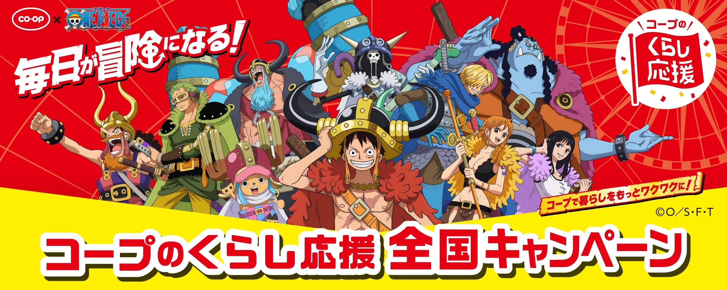 物価の高騰が続くなか、くらしを取り巻く環境は依然として厳しい状況にあります。本キャンペーンでは、組合員のくらしを支えるべく、通常の特別価格の商品に加え、さらなる特別価格のコープ商品を46品追加します。また、本キャンペーンをより身近に感じていただけるよう、TVアニメ 『ONE PIECE』とコラボし、さらに多くの組合員にご利用いただけるよう、キャラクターたちが店舗売り場や宅配誌面を盛り上げます。