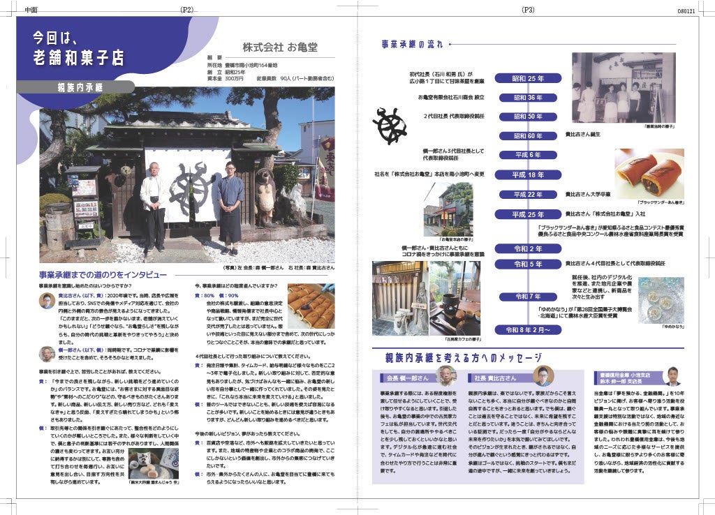 今回発行されたリーフレットでは、老舗和菓子店 株式会社お亀堂(本社:愛知県豊橋市/代表取締役:森貴比古)の事業承継事例が紹介されています。本リーフレットでは、創業70年以上続く和菓子店の事業承継の実体験や、4代目社長としての経営改革、今後のビジョンなどが紹介されています。
