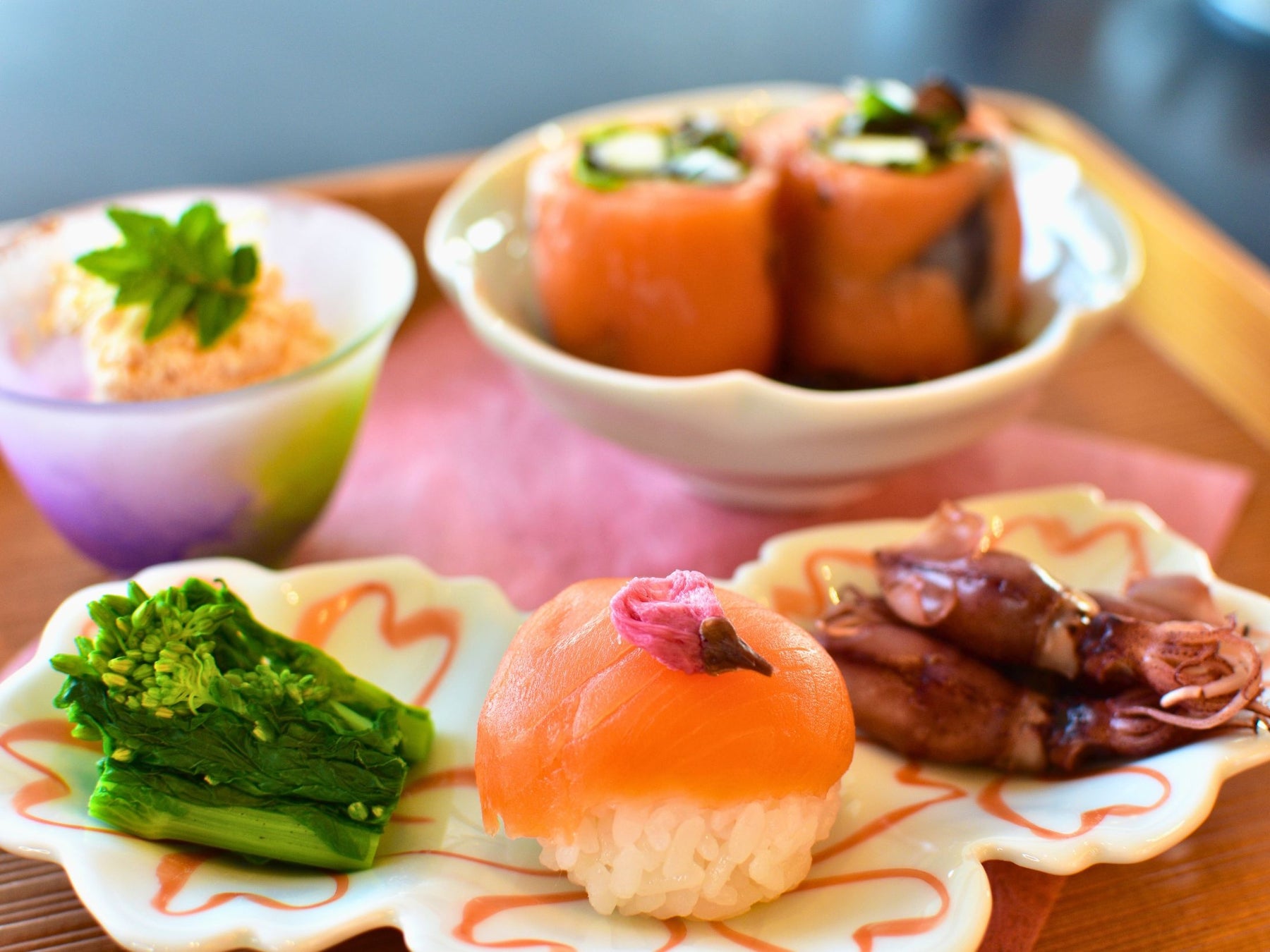 ・取肴 淡路島サクラマス手まり寿司、淡路島サクラマス生春巻き、ホタルイカ、菜の花、小蛸桜煮、木の芽