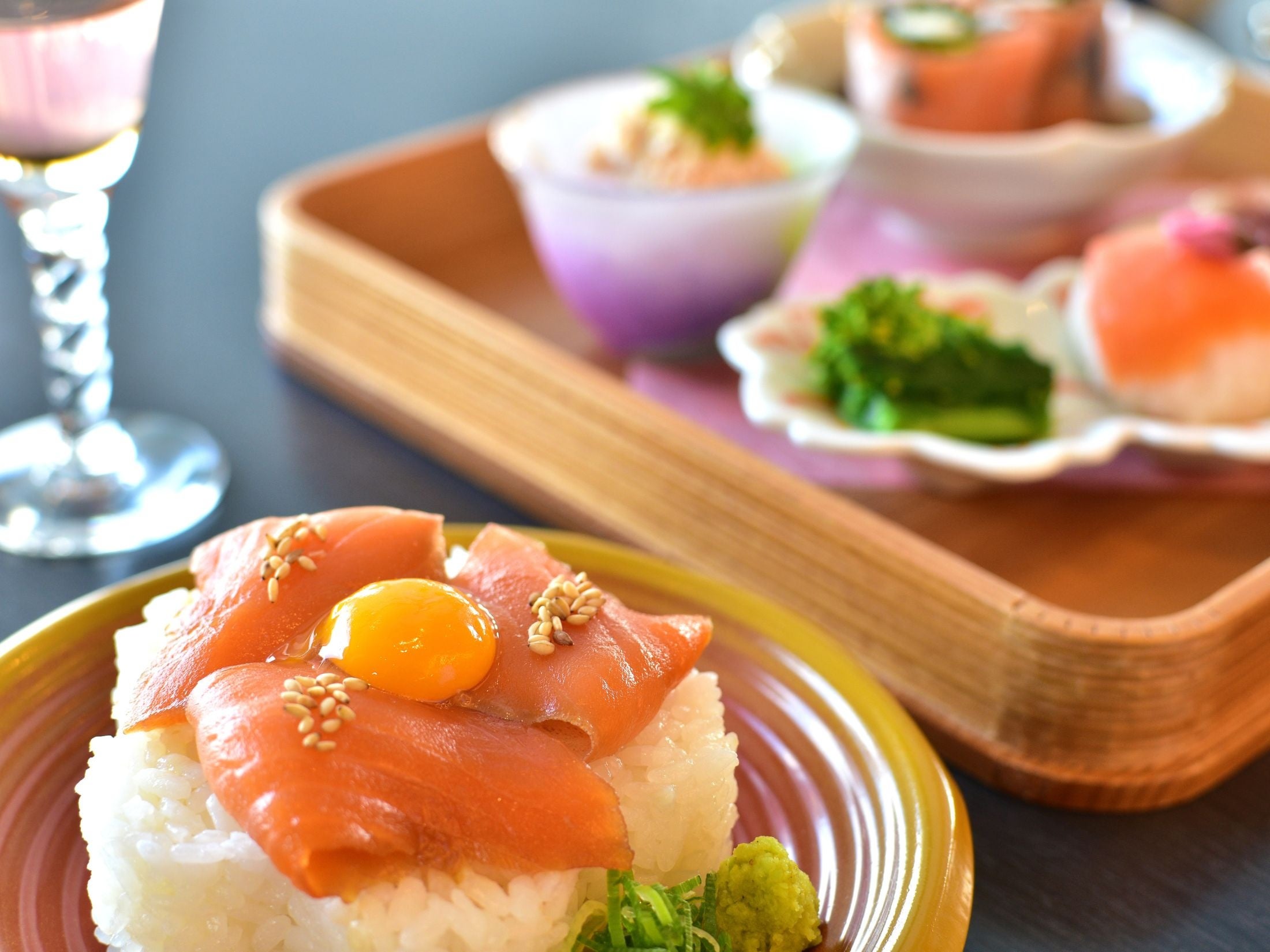 ランチメニュー「淡路島サクラマス春御膳『花霞』」は、春を彩る桜の花を添えた「手まり寿司」をはじめ、淡路島産新玉ねぎと味わう「生春巻き」、サクラマスと淡路放し飼いたまごのコクが際立つ「茶碗蒸し」、表面は香ばしく中はしっとりと揚げた「レアカツ」、さらに特製たれで旨味を引き出した「淡路島サクラマス御飯」など、5種類の淡路島サクラマス料理を中心に構成。ホタルイカや菜の花などの旬の食材とともに、春の訪れを感じられる華やかな御膳に仕上げました。