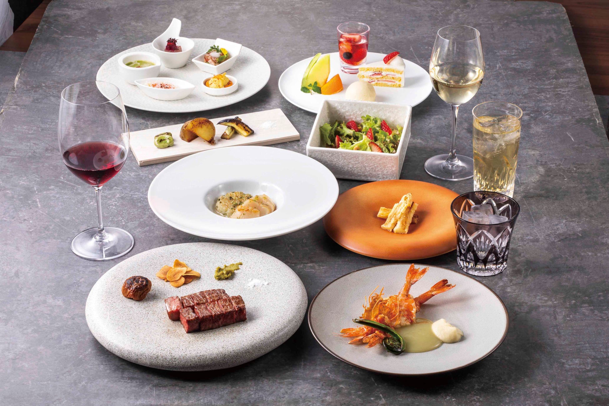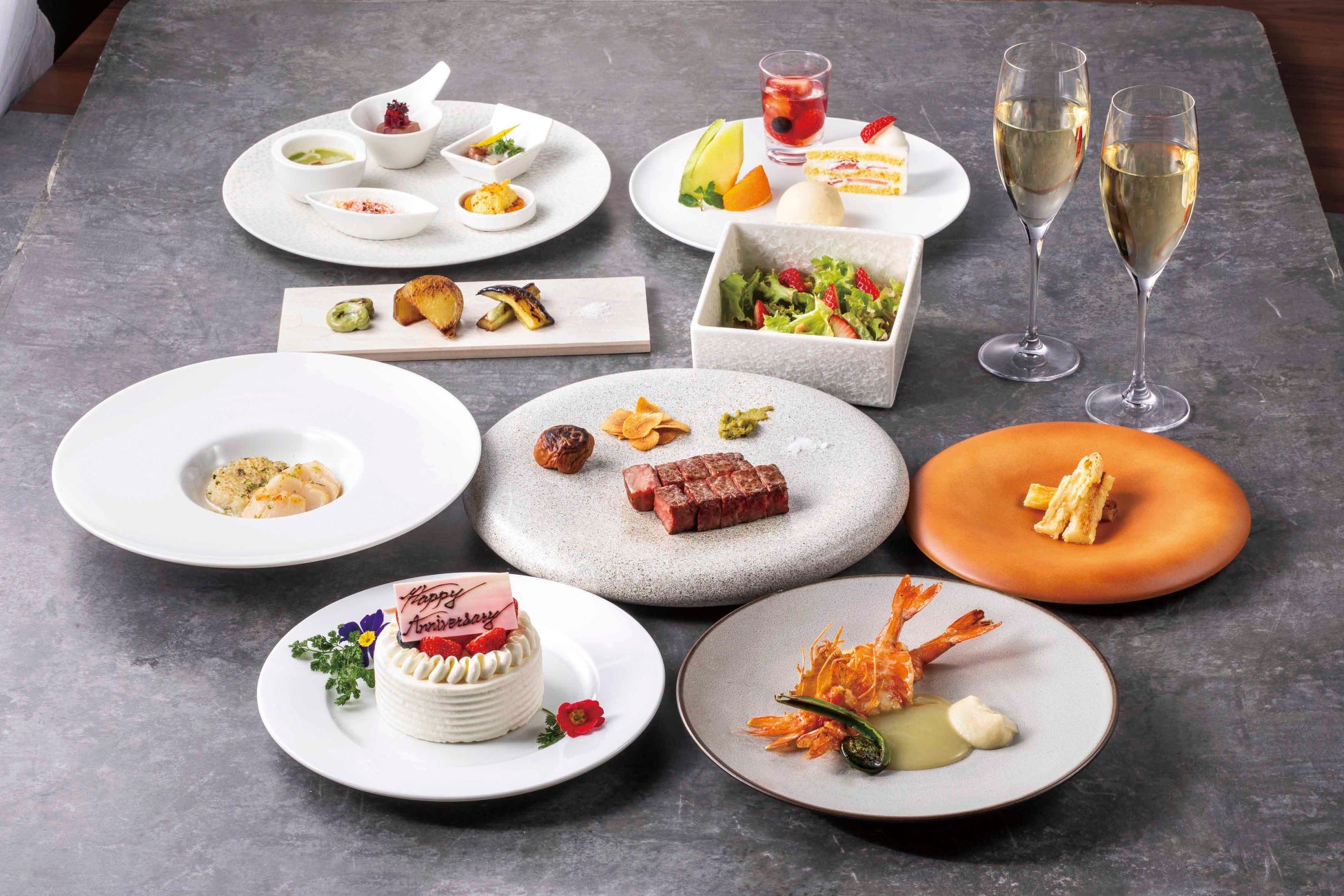 皆様の記念日に寄り添う特別コース。お祝いのスタートを飾る乾杯用グラスシャンパンと、コースの最後にはパティシエ特製のアニバーサリーデザートをご用意。空と海に囲まれたプライベートな空間で、皆様の記憶に深く刻まれる至福のひとときをお約束。