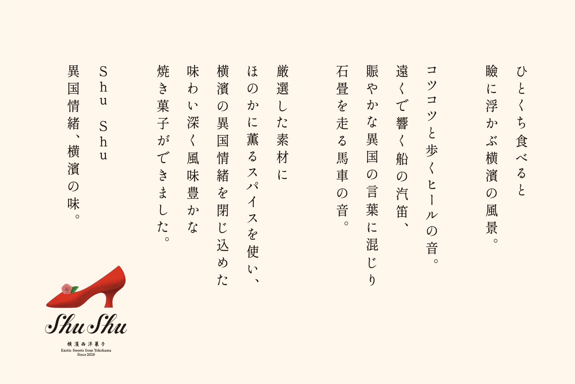 横浜発のスイーツブランド【 Shu Shu(シュシュ)】が誕生します。“赤い靴”をモチーフに、港町・横濱が歩んできた歴史と空気感を味わいで表現した新ブランドです。ほのかに薫るスパイスの余韻とともに、“新しい横濱西洋菓子”を提案します。