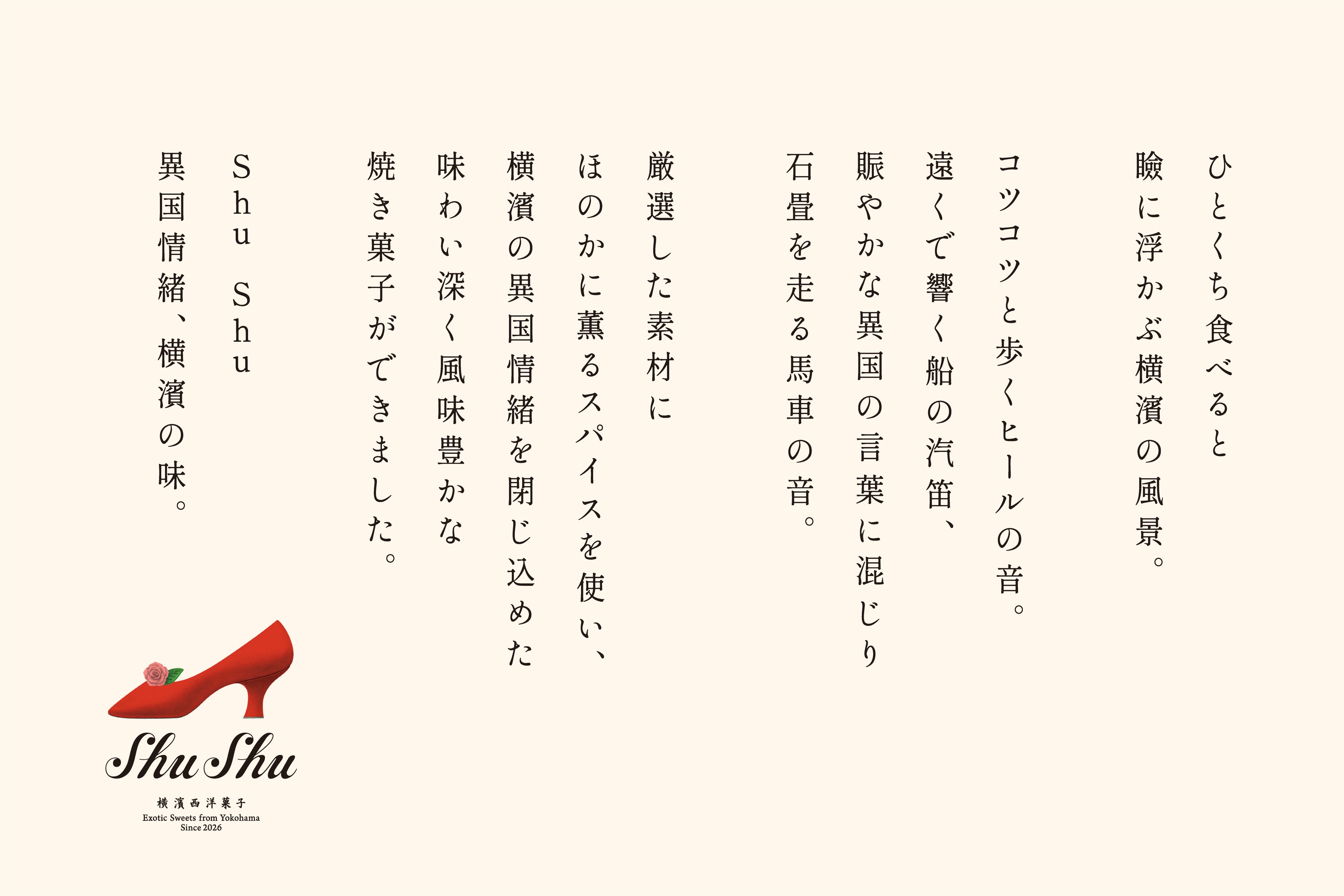 横浜発のスイーツブランド【 Shu Shu(シュシュ)】が誕生します。“赤い靴”をモチーフに、港町・横濱が歩んできた歴史と空気感を味わいで表現した新ブランドです。ほのかに薫るスパイスの余韻とともに、“新しい横濱西洋菓子”を提案します。