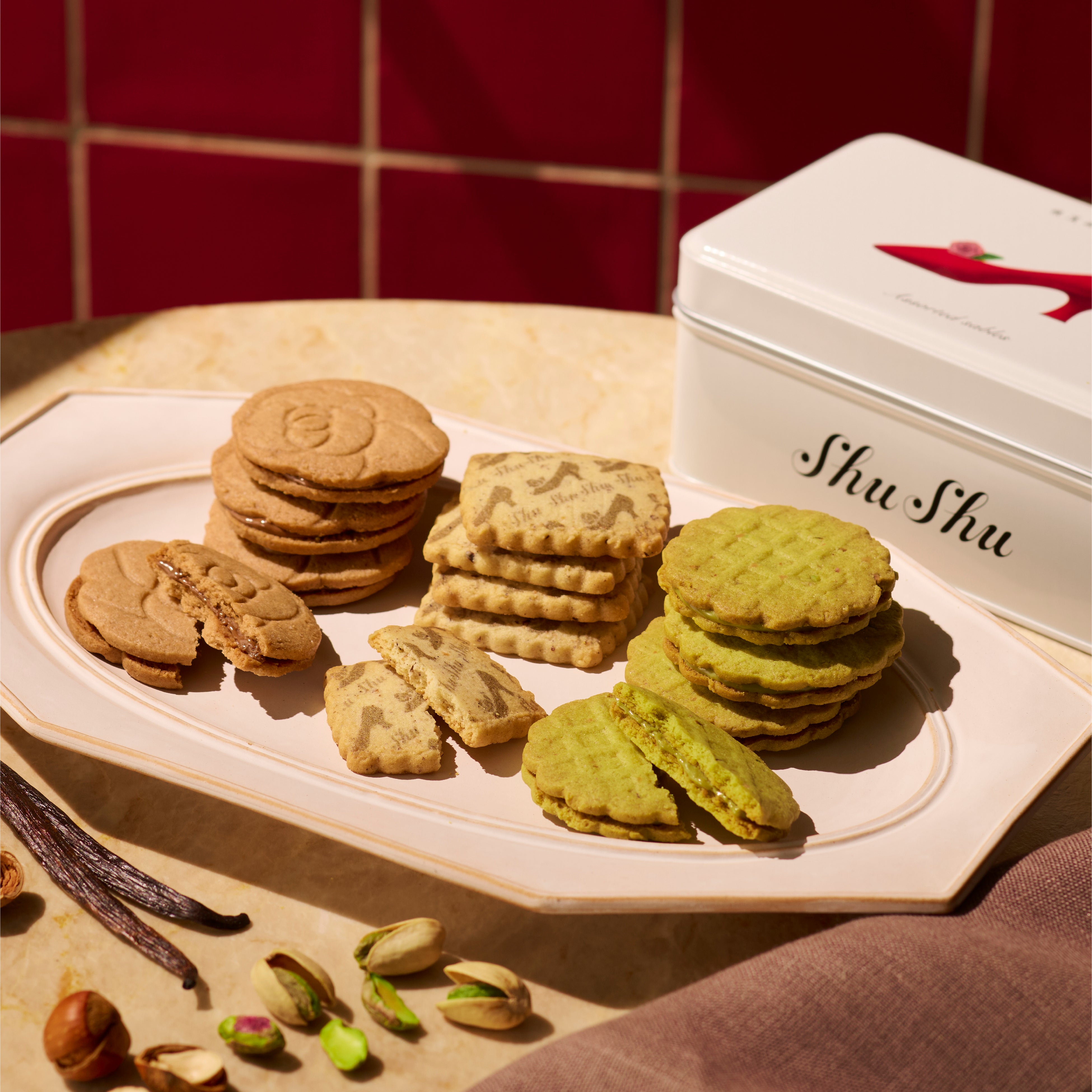 バニラ・ピスタチオ・ヘーゼルの3種のサブレが入ったShu Shu自慢のアソート。バニラ、カルダモン、シナモンをそれぞれに絶妙な配合で練り込み、記憶に残るひとしなに仕上げました。