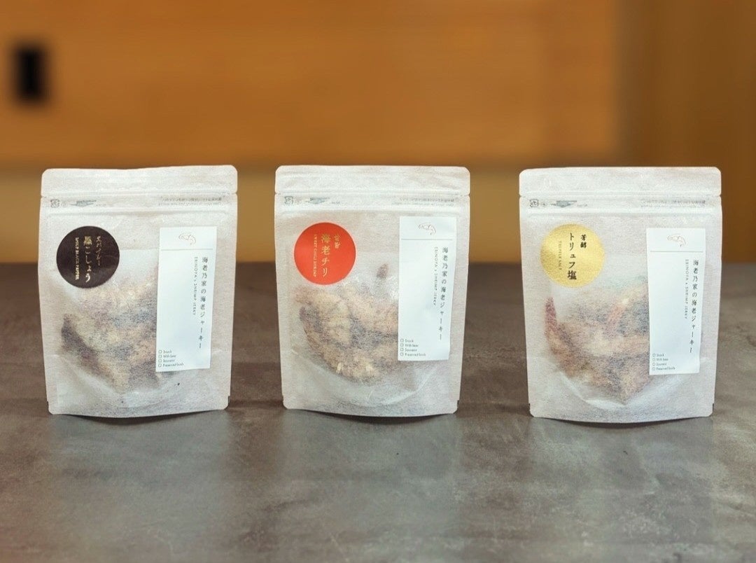 海老の旨味を凝縮したジャーキーは、お酒のおつまみや観光のお土産として人気の商品です。今回、新たに2種類の味が加わり、海老専門店ならではの新しい味わいを楽しめる商品となりました。