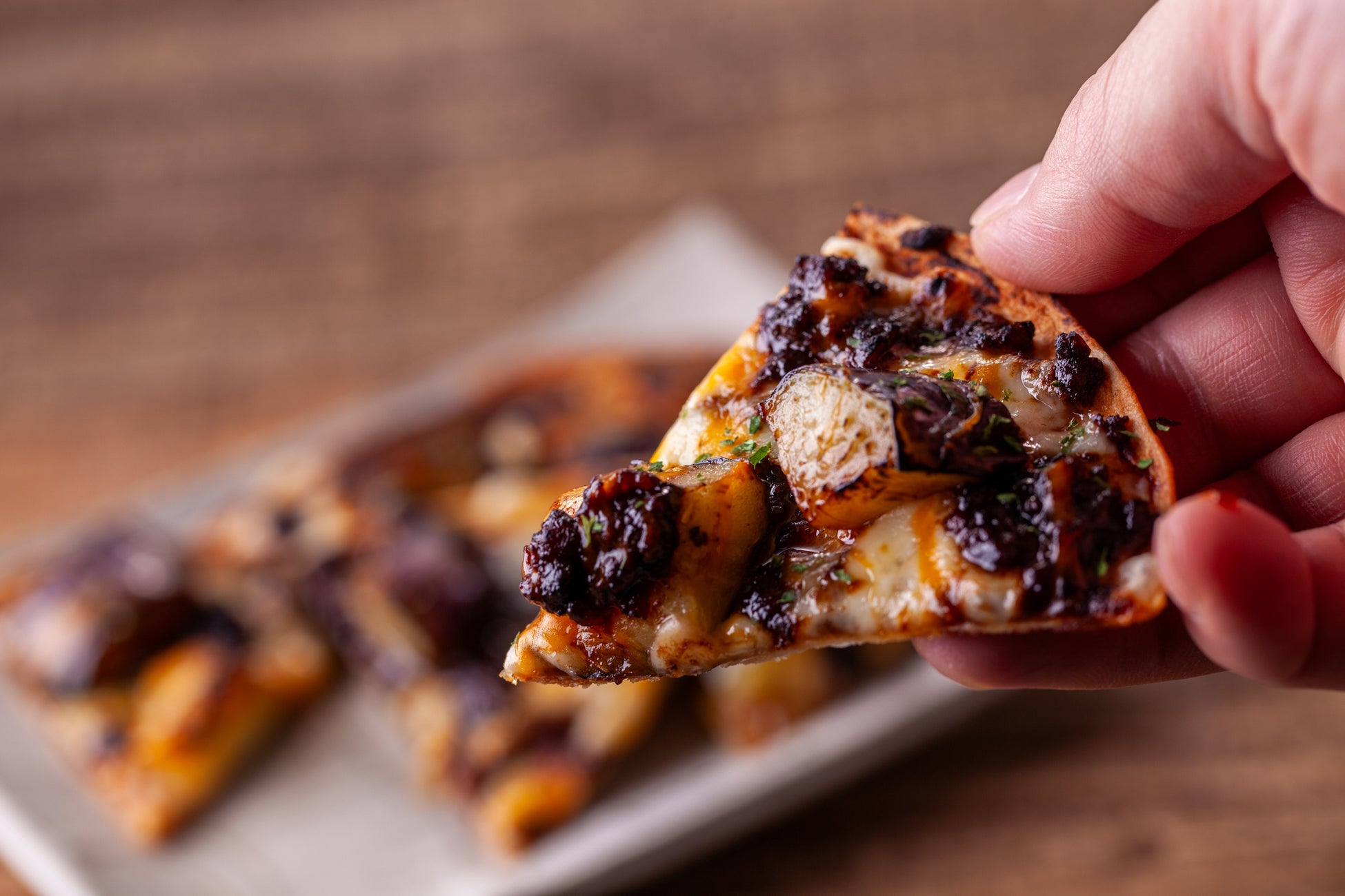 コクと旨味が特長の赤味噌とマイルドなチェダーチーズ、塚田農場で人気の宮崎の伝統野菜「佐土原ナス」を使用したおつまみピザ。