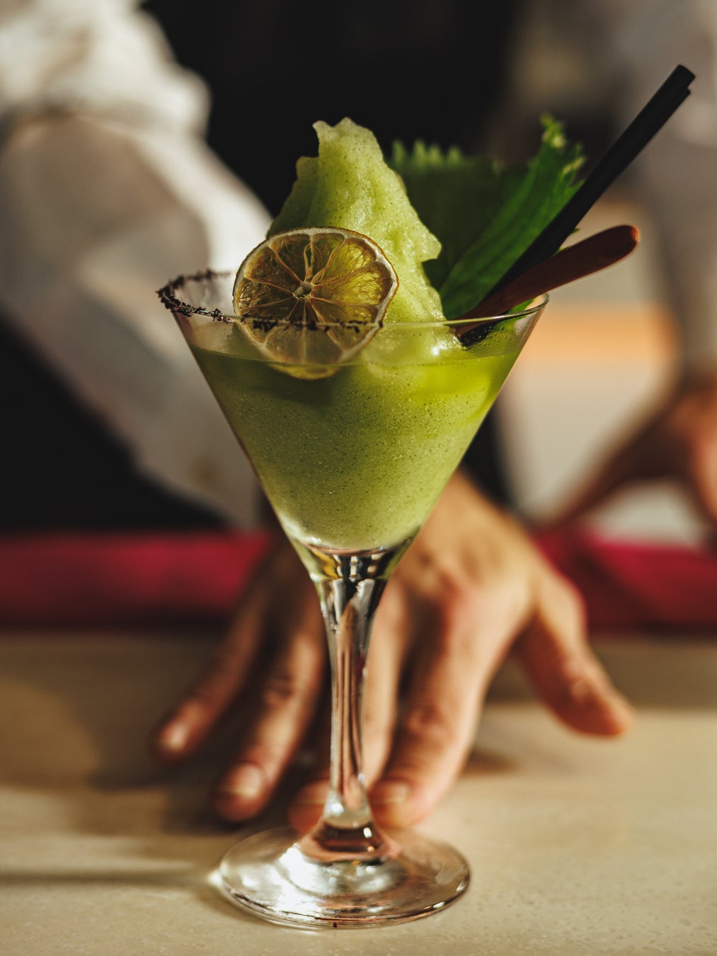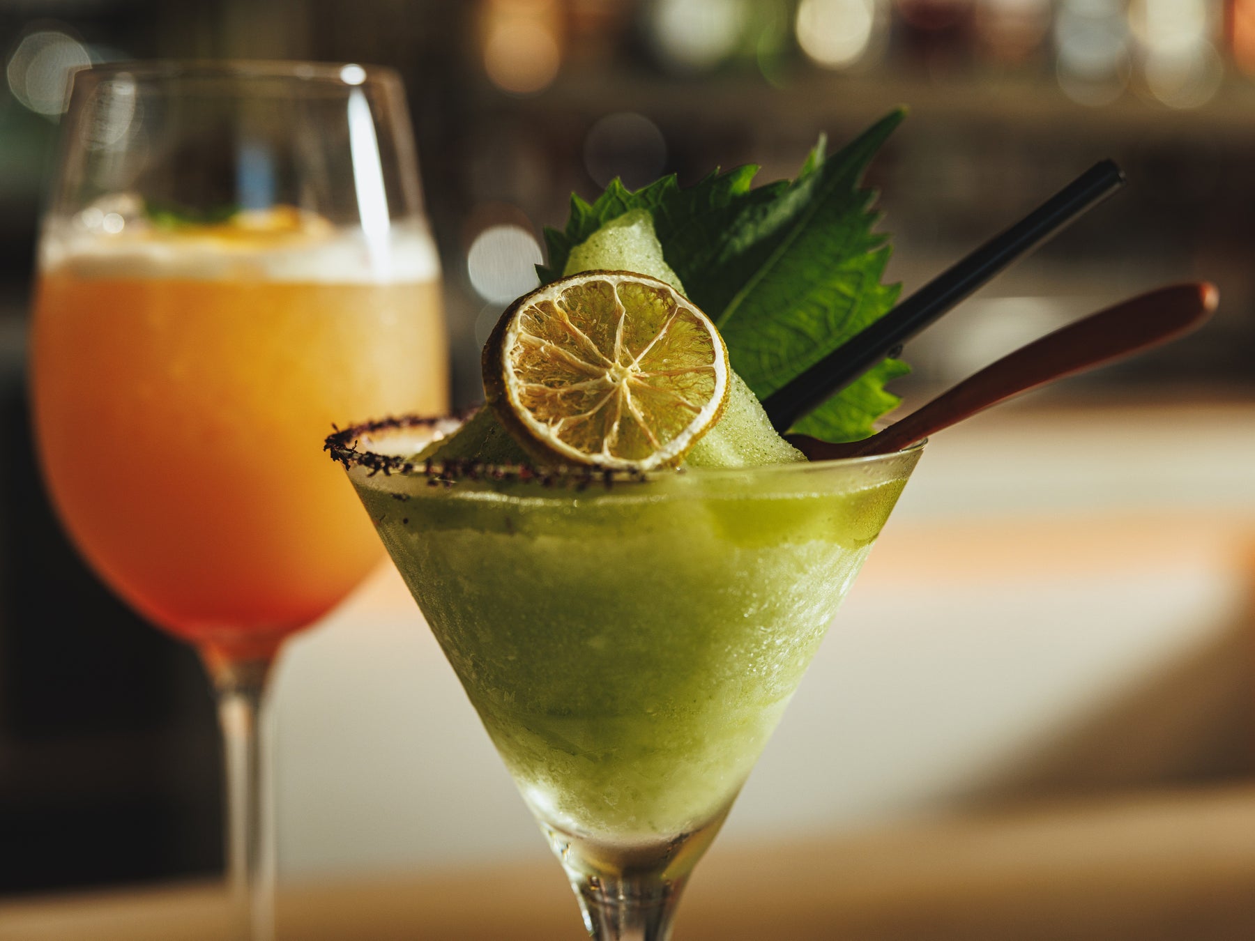「MISATY NEW YORK」は、クエルボ1800 プラタにオレンジリキュールやライム、そして和山葵や大葉を加えたフローズンマルガリータです。洗練された雰囲気と幻想的な街明かりが交差する霧がかる夜のNYの情景を、想像力を掻き立てる素材で、ミステリアスで幻想的な自然の調和として表現。ステーキとの相性も良い和山葵と爽やかな大葉の余韻が、静かで美しい響きを予感させます。