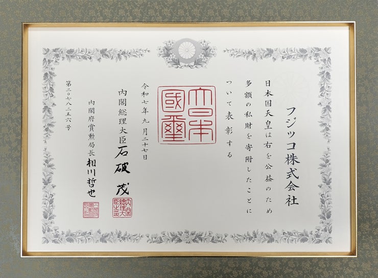 フジッコ株式会社(本社:神戸市中央区/代表取締役社長執行役員:福井正一)は、この度、2024 年度に兵庫県丹波篠山市へ行った寄附により、社会貢献活動を積極的に推進してきた功績が認められ、内閣府より「紺綬褒章」を受章いたしましたのでお知らせいたします。受章に伴い、2026 年3 月5 日に丹波篠山市役所にて伝達式が行われました。
