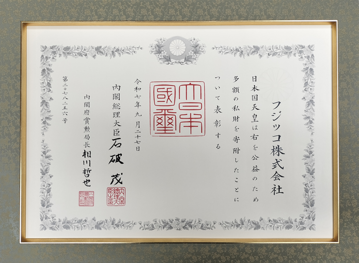 フジッコ株式会社(本社:神戸市中央区/代表取締役社長執行役員:福井正一)は、この度、2024 年度に兵庫県丹波篠山市へ行った寄附により、社会貢献活動を積極的に推進してきた功績が認められ、内閣府より「紺綬褒章」を受章いたしましたのでお知らせいたします。受章に伴い、2026 年3 月5 日に丹波篠山市役所にて伝達式が行われました。