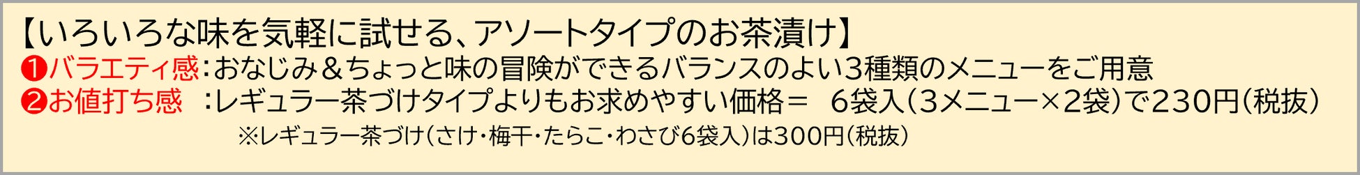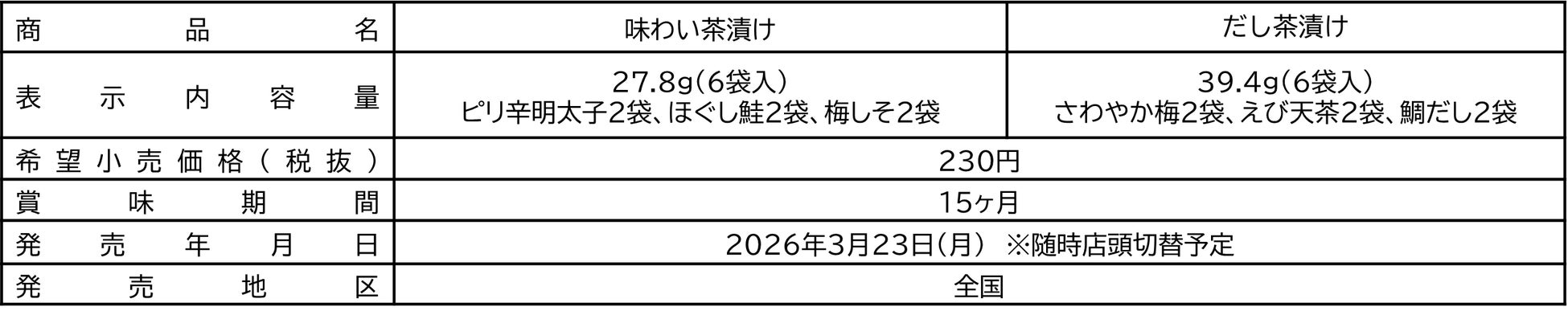 株式会社 永谷園(社長:掛谷 浩志、東京都港区)は、 現在発売中のお茶漬けバラエティパック「味わい茶漬け」「だし茶漬け」を、お茶づけライトユーザーのお客様が手軽にお手に取っていただける商品としてリニューアルいたします。