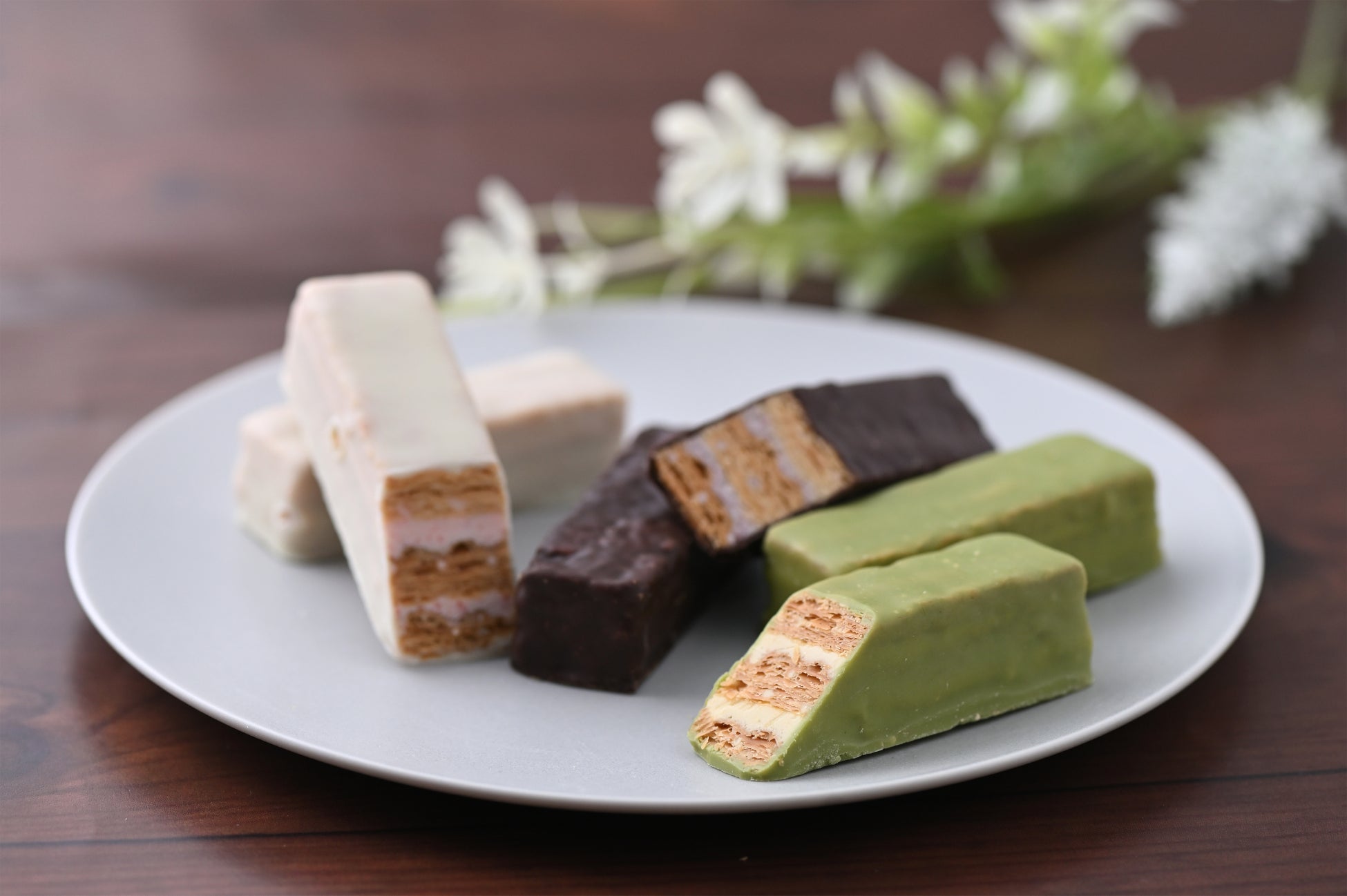 やわらかな求肥で、なめらかなこしあんとクリームを包みました。中にはゲランド塩をほんの少し忍ばせ、甘さの中にアクセントを加えています。クリームは、〈ホイップクリ―ム〉と〈抹茶クリーム〉の2種類をご用意しております。