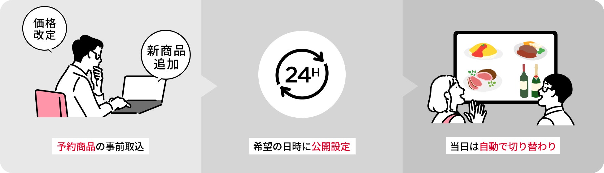 季節限定商品やフェアメニュー、事前告知を行う予約商品(新商品・価格改定)は、売上向上に欠かせない施策である一方、営業当日の登録・修正作業が現場の大きな負担となっていました。
