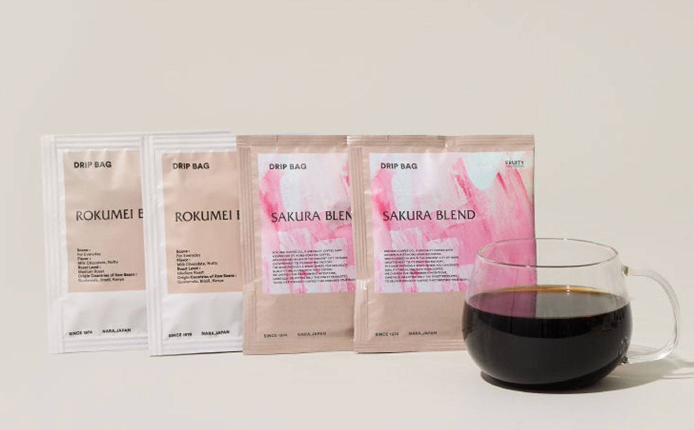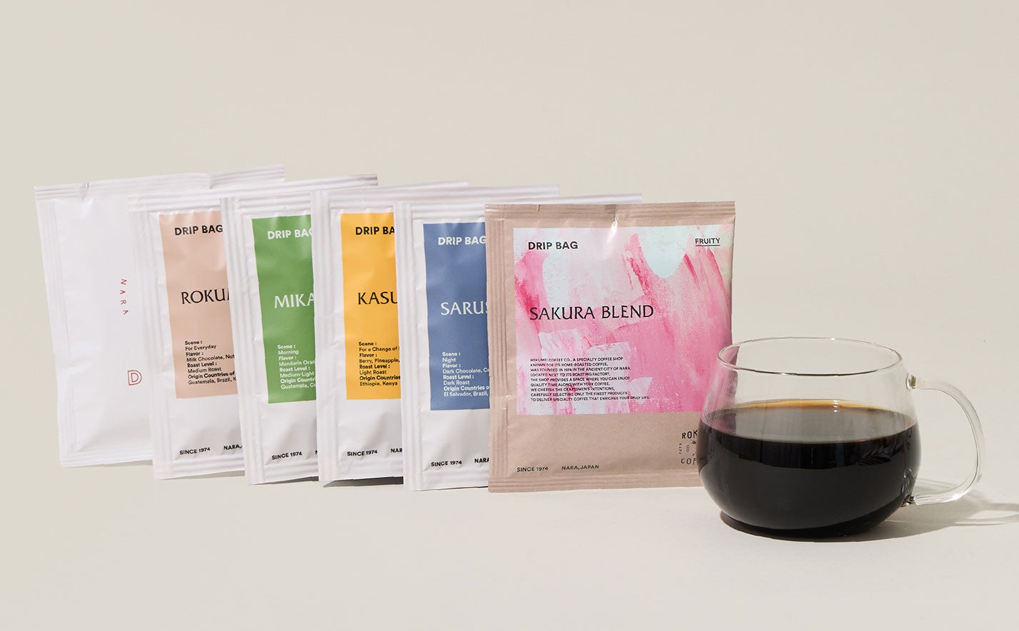 「さくらブレンド」をはじめ、日常の定番「ロクメイブレンド」、優しい甘さでモーニングにぴったりの「ミカサブレンド」、フルーティで華やかな「カスガブレンド」、そしてミルクと相性抜群の深煎り「サルサワブレンド」をラインアップ。注目は、ティーバッグのようにお湯に浸すだけで完成する「DIPSTYLE デカフェ」。カフェインだけではなく、抽出の手間まで抜いたこのデカフェは、中深煎りでコーヒー感がしっかりあります。夜のリラックスタイムなど、「カフェインを気にせずコーヒーを楽しみたい」というお声に応えます。浅煎りの華やかさから深煎りのコク、そしてデカフェまで、その日の気分やシーン、合わせるスイーツによって飲み分けられる、全20枚の贅沢なセットです。