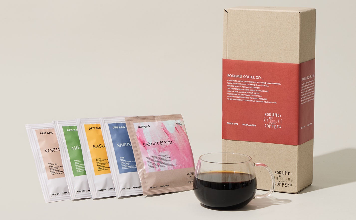 内容:ドリップバッグ ロクメイブレンド7枚・ドリップバッグ ミカサブレンド7枚・ドリップバッグ カスガブレンド7枚・ドリップバッグ サルサワブレンド7枚・ドリップバッグ さくらブレンド12枚