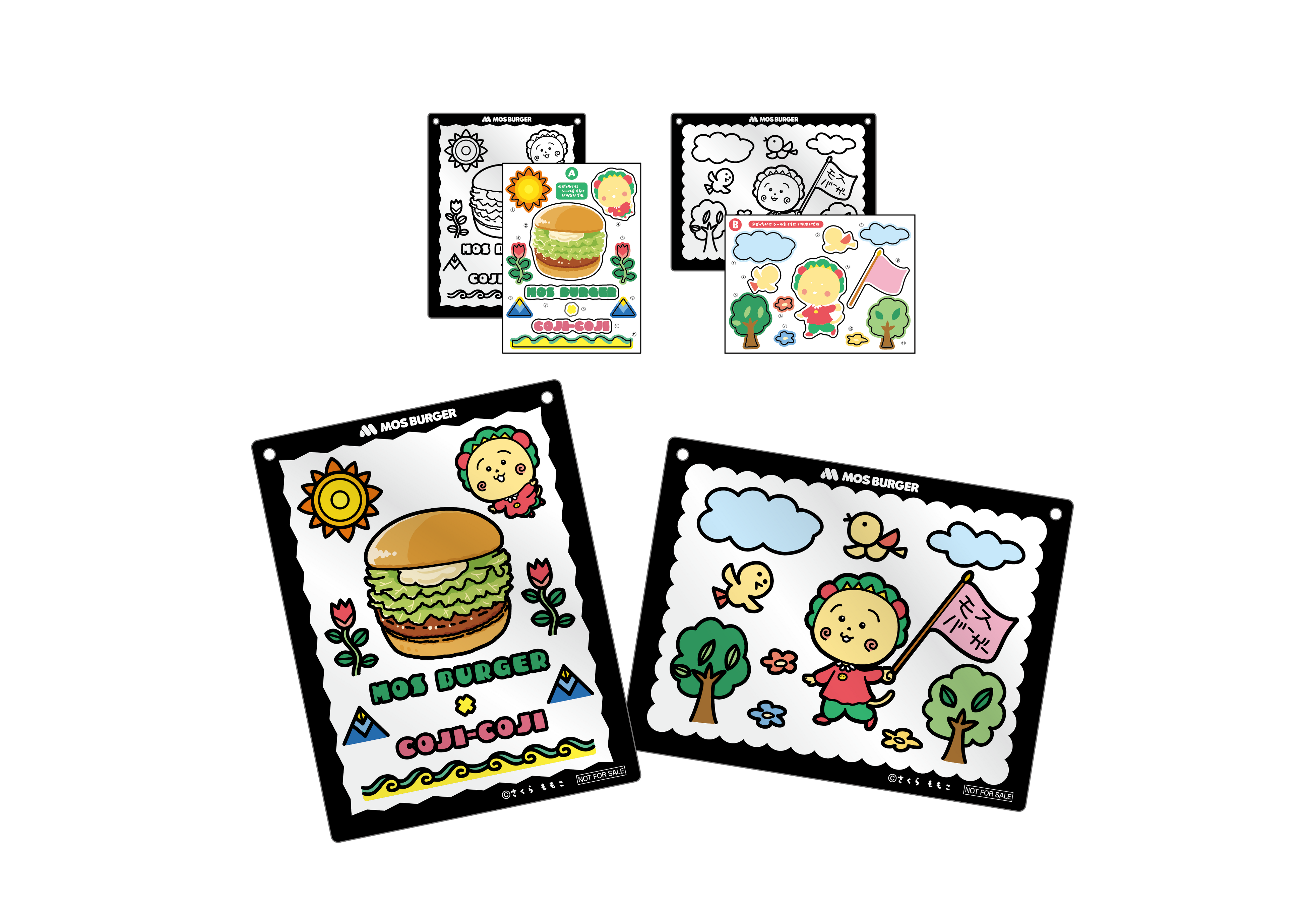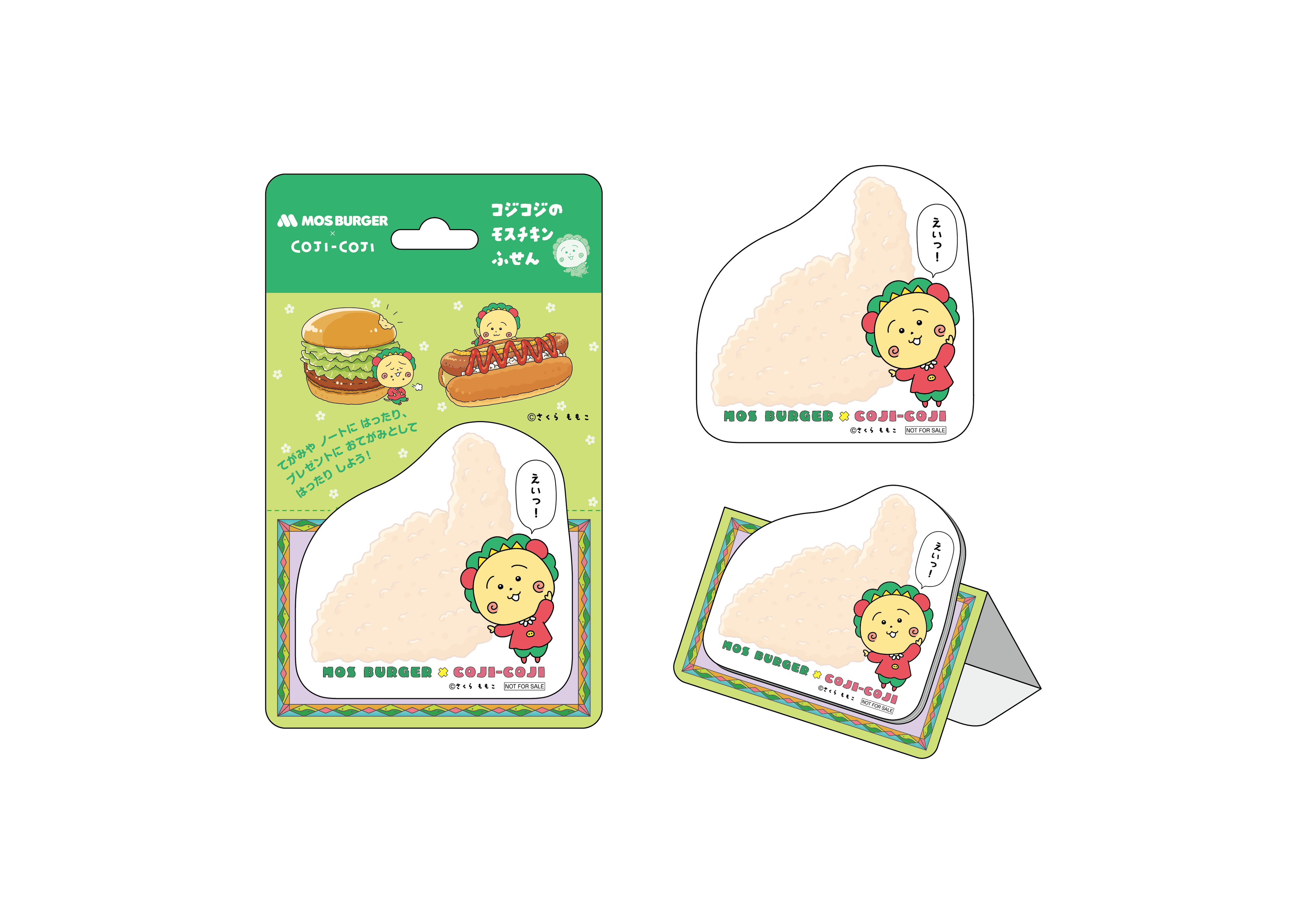 コラボのおまけは、ぬりえシートに色のついた透明なシールを貼って楽しめる「コジコジとぺたぺたシールぬりえ」、描きおろしイラストを使用したシールが入った「コジコジのシールいりかんケース」、冷蔵庫などに貼り付けて楽しめる「コジコジのおしゃべりマグネット」、そして『モスチキンのマネをするコジコジ』をデザインした「コジコジのモスチキンふせん」の4種類です。対象のお子様向けのモスワイワイセットや低アレルゲンメニューのセットのご購入で、お好きなおまけを1つお選びいただけます。