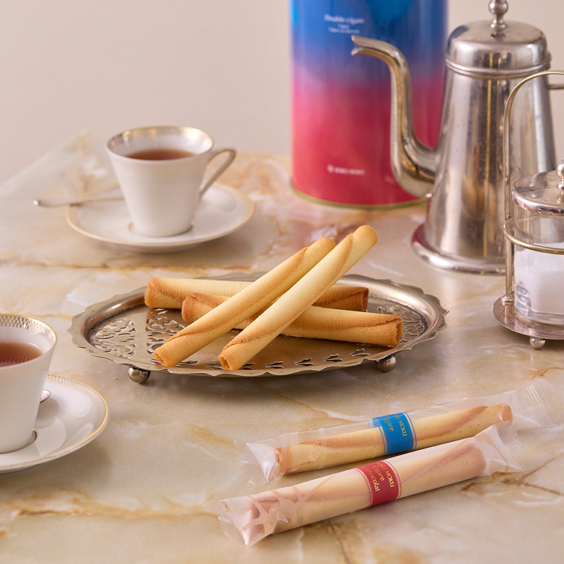 ロングセラーの「シガール®」と、シガール®にミルクチョコレートを詰めた「シガール オゥ ショコラ」を、上品でやわらかな印象のオリジナルデザイン缶に詰め合わせた「ドゥーブル シガール」。