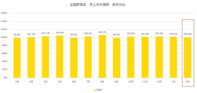 2月度の前年対比の売り上げ伸長率は、前月から0.8pt減少した。売り上げは前年対比100.8%とプラスとなった。